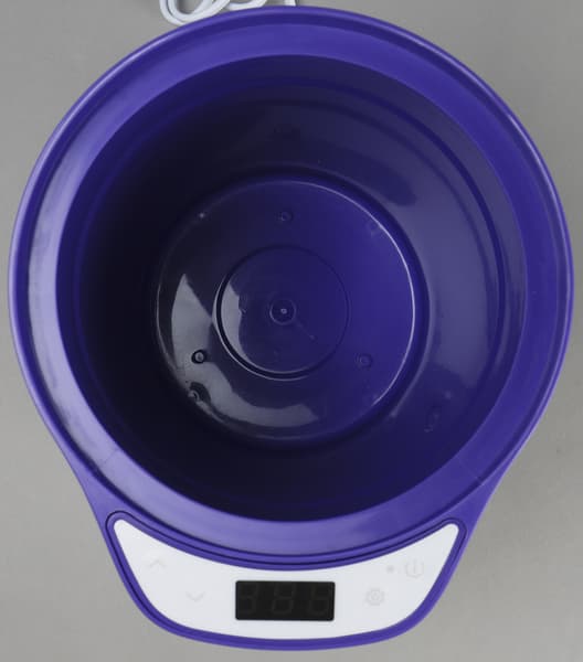 Белый снаружи пластиковый корпус, украшенный фиолетовыми декоративным пояском, стремится к форме вертикального цилиндра. Поэтому прибор не займет много места на кухонной поверхности. Фиолетовая полоска окаймляет также выступ, на котором расположена панель управления.