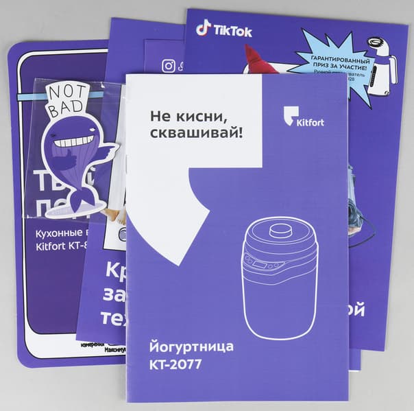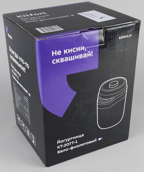 Йогуртница приехала нам в коробке, по которой сразу можно определить, кто ее произвел, — даже если заклеить название компании. Белые надписи на черном фоне, вставка фиолетового цвета и, конечно, креативный слоган на передней стороне сразу говорят нам: это прибор фирмы Kitfort.