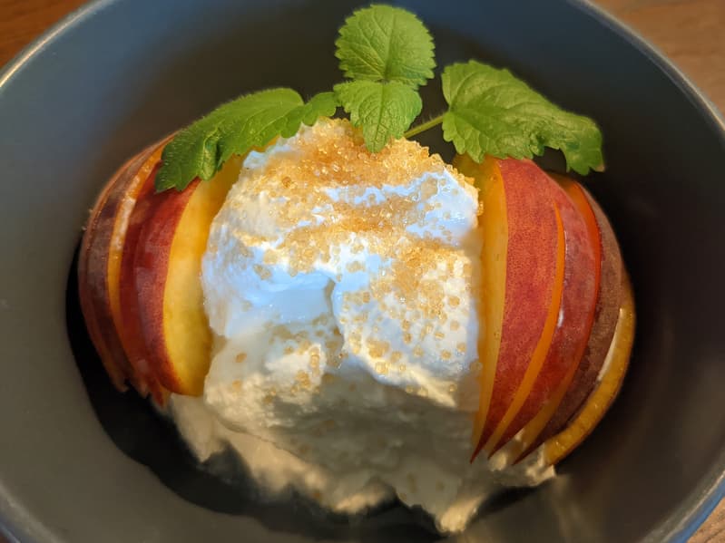 При этом вкус достаточно нейтрален, поэтому получившийся продукт можно с удовольствием съесть просто так (признаемся, что прямо из стакана мы тут же попробовали почти половину), подсолить и подать к овощам вместо сметаны — или, как сделали мы, посыпать сахаром (в нашем случае — тростниковым) и украсить фруктами и мятой по желанию.