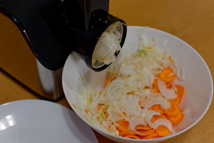 В случае лука результат ожидаемо зависит от повара и того, насколько правильно он подает сырье в горловину и проталкивает его. В нашем случае результат оказался хорошим: весь лук оказался равномерно нашинкован и лишь один лепесток размером в четверть одного лукового слоя остался непорезанным. Такой результат оказался возможен благодаря наличию режима с медленным вращением шнека.