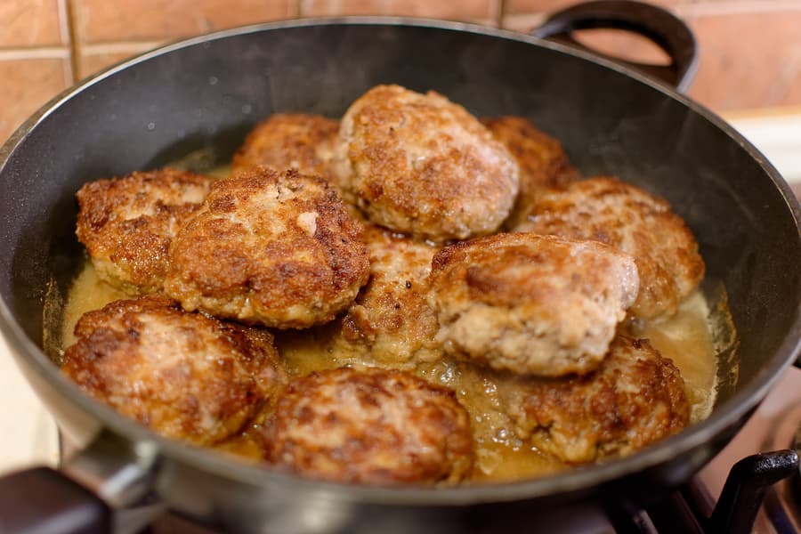 Чтобы жесткая говядина стала мягкой, на дно большого сотейника налили немного воды и после обжаривания потушили в ней котлеты.
