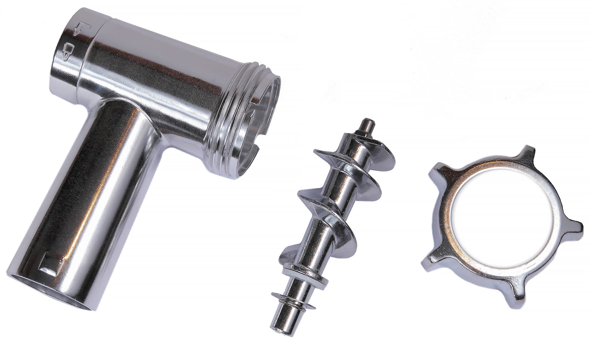 Горловина, шнек и зажимная гайка у Kitfort KT-2104 металлические (алюминиевые). Ножи и формовочные диски — стальные.