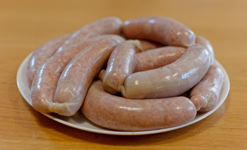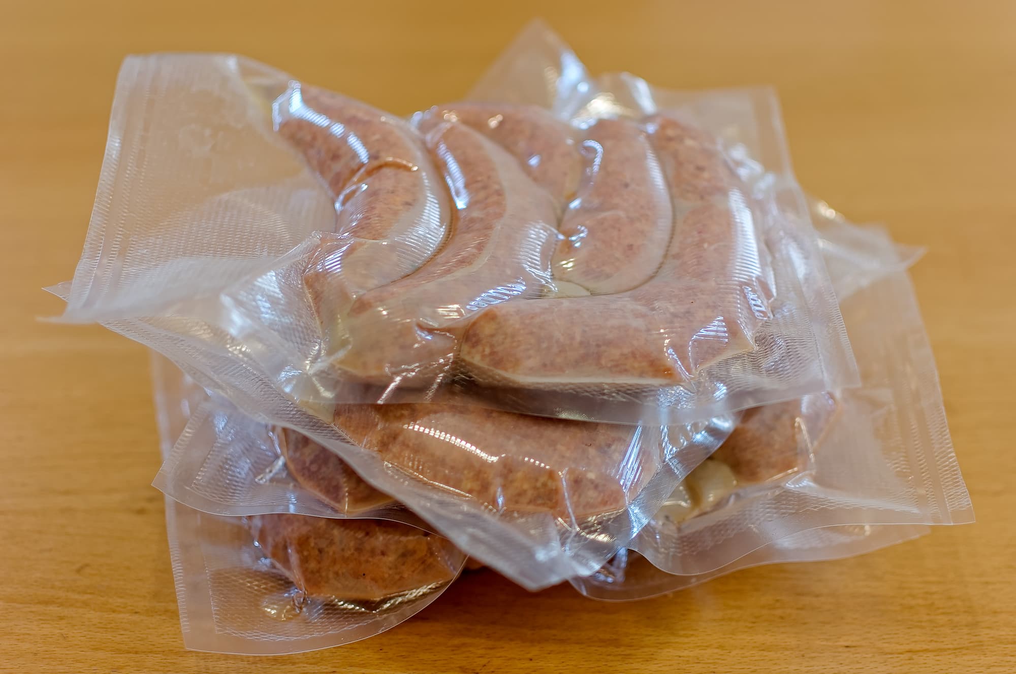 Колбаски вакуумировали и отварили в су-виде при температуре 80 градусов, так что полученный полуфабрикат перед употреблением остается только быстро обжарить для придания румяной корочки.