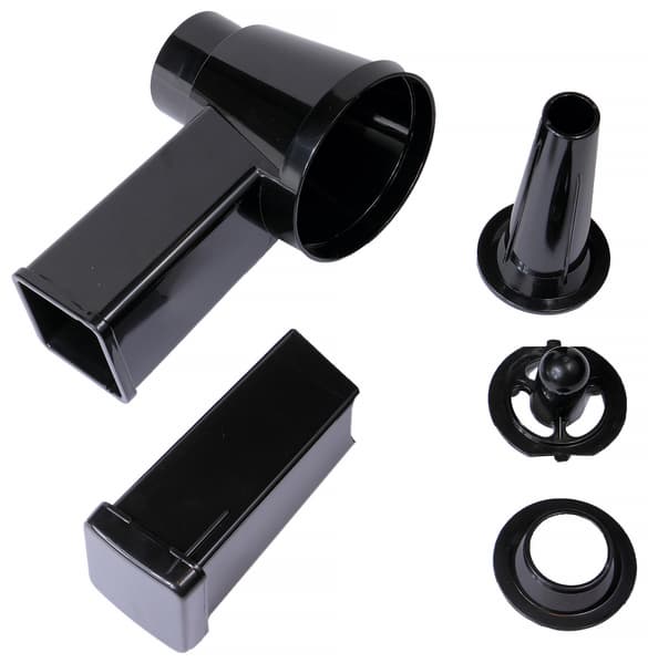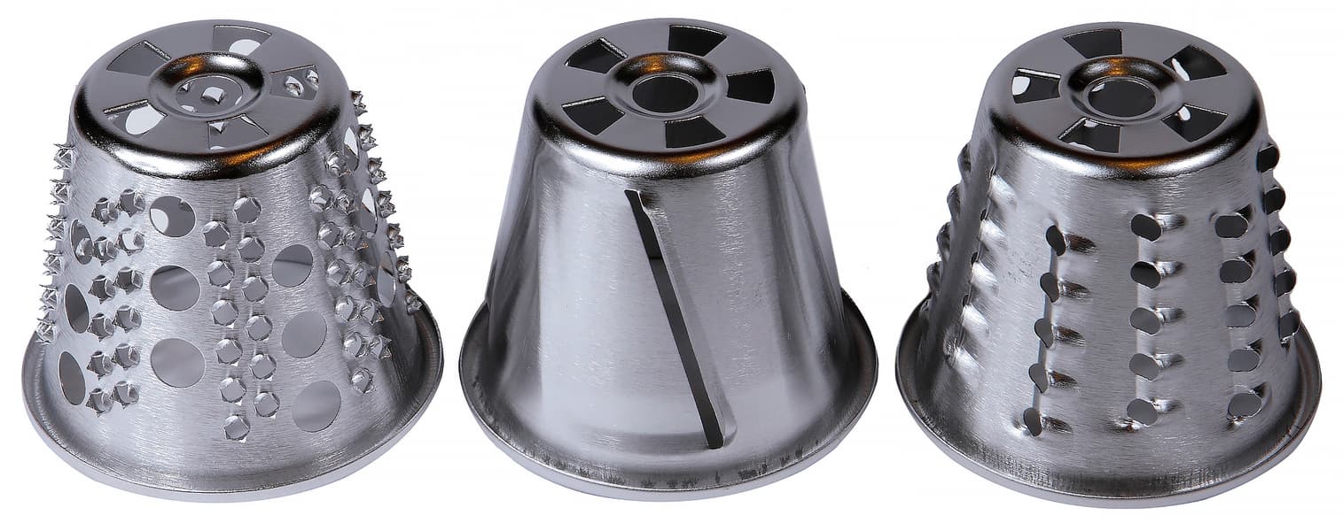 Насадки для кеббе и колбасок черные пластиковые, насадки для терок — тоже, а сами терки изготовлены из стали.