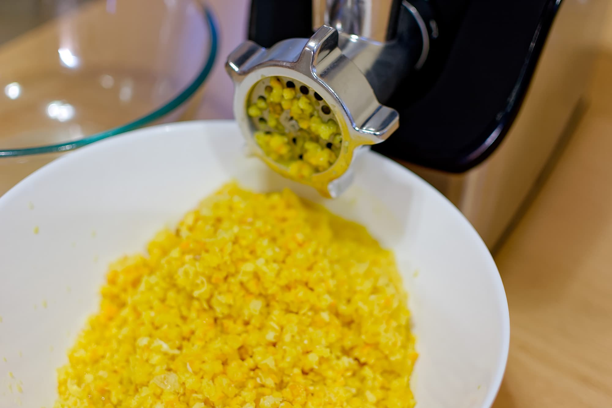 Содержимое сковородки пропустили через мелкую решетку на медленном режиме, добавив примерно 150 граммов сливочного масла. Медленный режим снова оказался весьма полезен и нам, и мясорубке — перекладывать довольно горячие продукты со сковороды и запихивать их в горловину у нас получалось не очень быстро, а проталкивать через такие маленькие дырочки без лишнего давления и спешки было легче прибору.