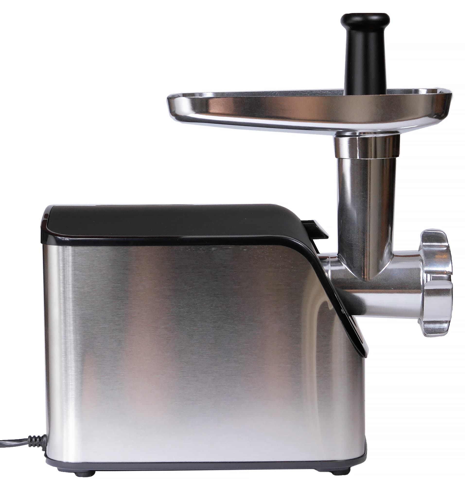 Лоток для подачи подготовленных продуктов сделан из алюминия, а толкатель — из пластика софт-тач. Это ощутимо добавляет удобства в работе с мясом.