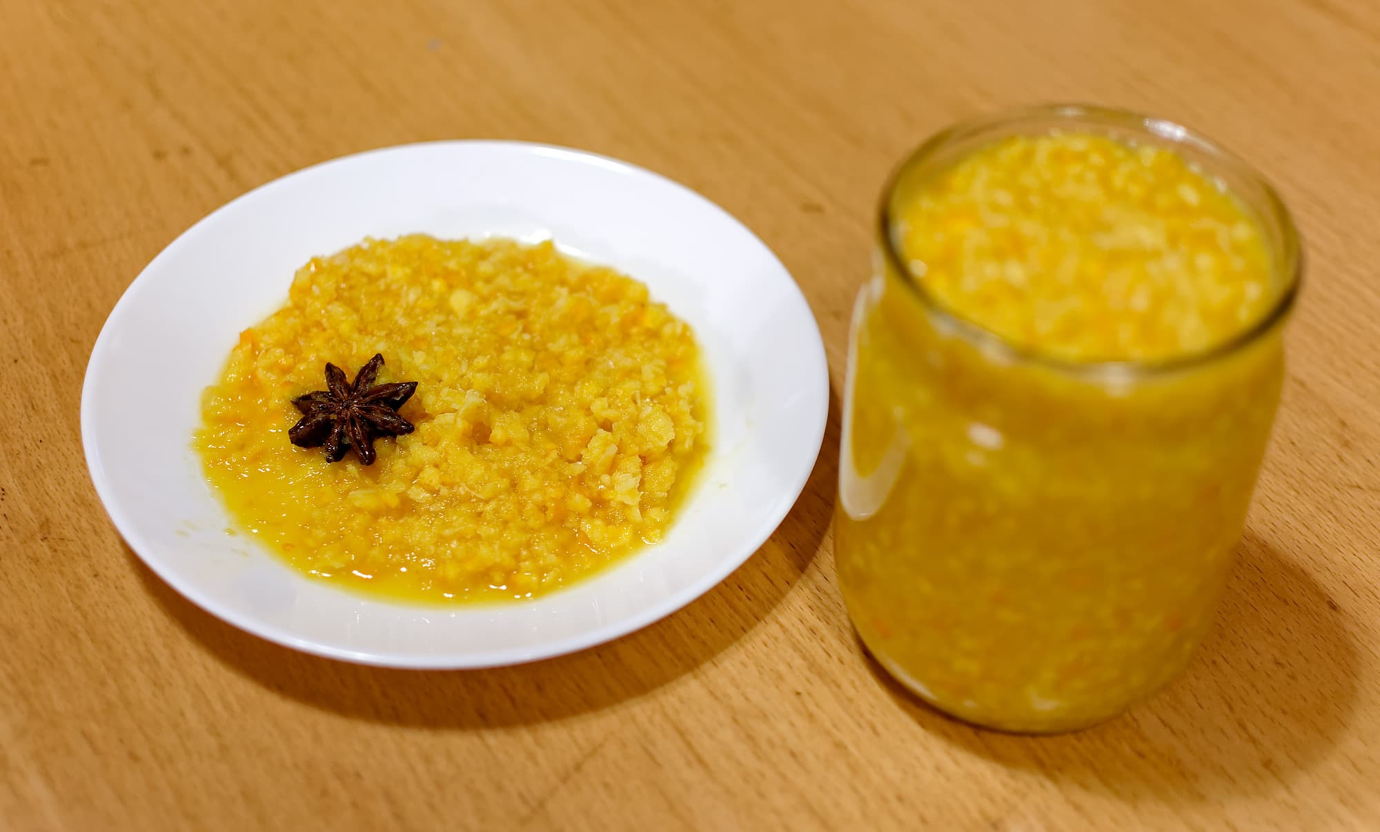 Качество готового апельсинового фарша оказалось на высоте. Мы добавили к апельсинам примерно треть объема сахара, сок половинки лимона, палочку корицы и звездочку бадьяна, и прокипятили в течение 10 минут. Получилась ароматная масса, которую можно есть ложкой, добавлять в йогурт и использовать в качестве начинки для кондитерских изделий.