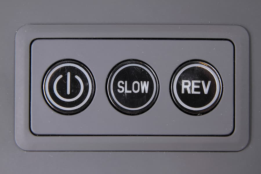 Справа вверху у мясорубки расположен блок управления, состоящий из трех механических кнопок: обычная скорость, медленное вращение и обратное вращение.