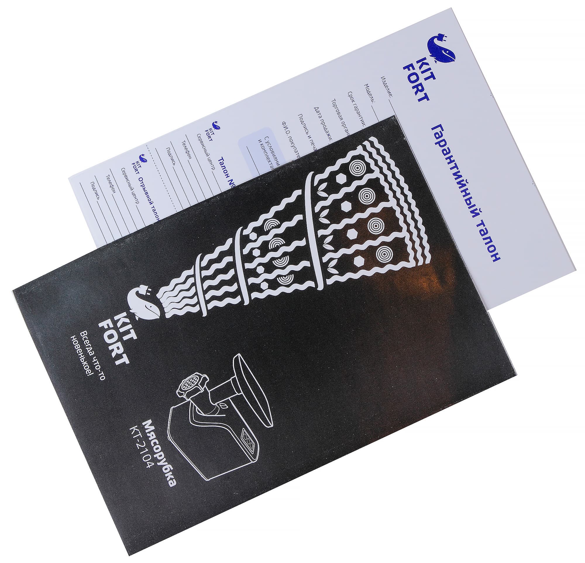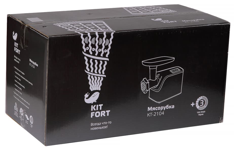 Мясорубка поставляется в картонной коробке, оформленной в необычной для Китфорта черно-белой расцветке. Сразу видно ожидаемое: схематическое изображение прибора и давно знакомый нам симпатичный кит.
