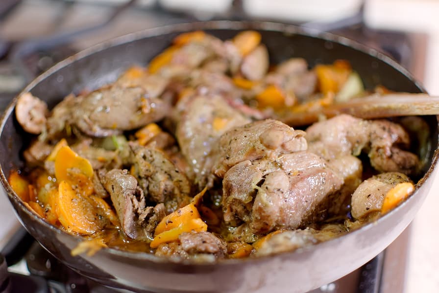 Вы взяли примерно по 400 граммов утиной печени и столько же филе бедра утки вместе с жиром и шкуркой. Обжарили на сковороде нашинкованные выше овощи, добавив в середине процесса мясо утки, а ближе к концу — утиную печень. Из специй использовали соль, черный перец и смесь прованских трав, а также немного мускатного ореха.