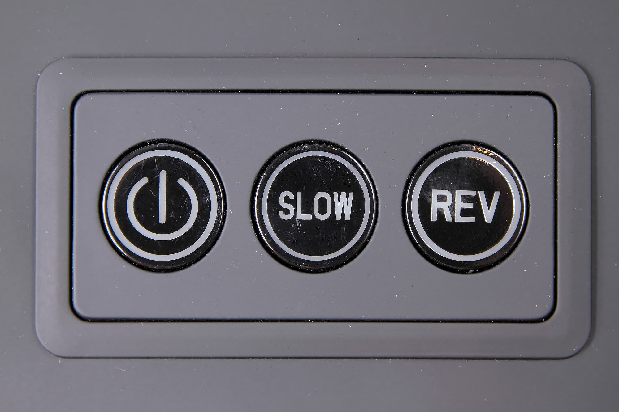 Основная кнопка запускает мясорубку. Вторая, дополнительная кнопка запускает и отключает медленный режим, а третья — реверс — заставляет вращаться мотор в обратную сторону. Это может пригодиться в случае, если содержимое мясорубки забилось жилами или другим сложным для обработки продуктом.