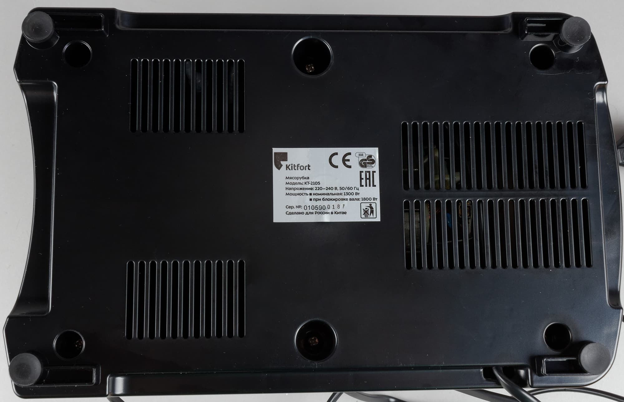 На нижней стороне моторного блока имеются четыре прорезиненные ножки, вентиляционные отверстия и наклейка с названием модели, краткими техническими характеристиками, серийным номером и указанием страны-производителя.