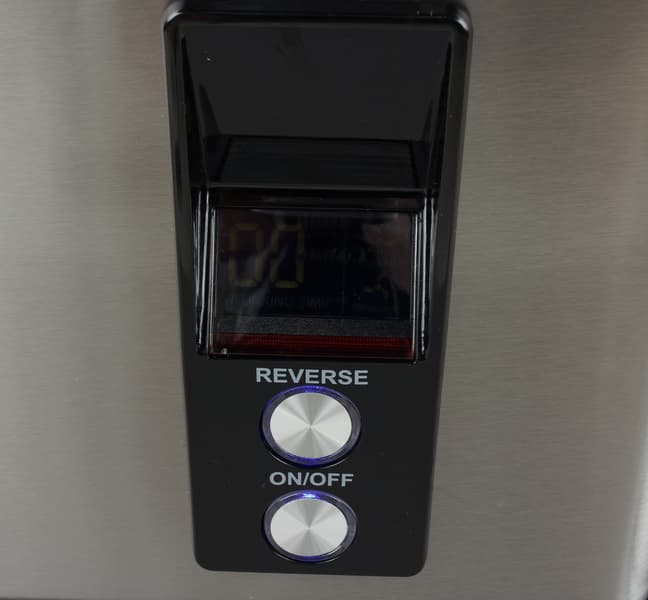 Панель управления состоит из двух кнопок — «On/Off» и «Reverse» — и дисплея. Для запуска и остановки мясорубки используется первая кнопка, для запуска ее обратной работы — вторая.