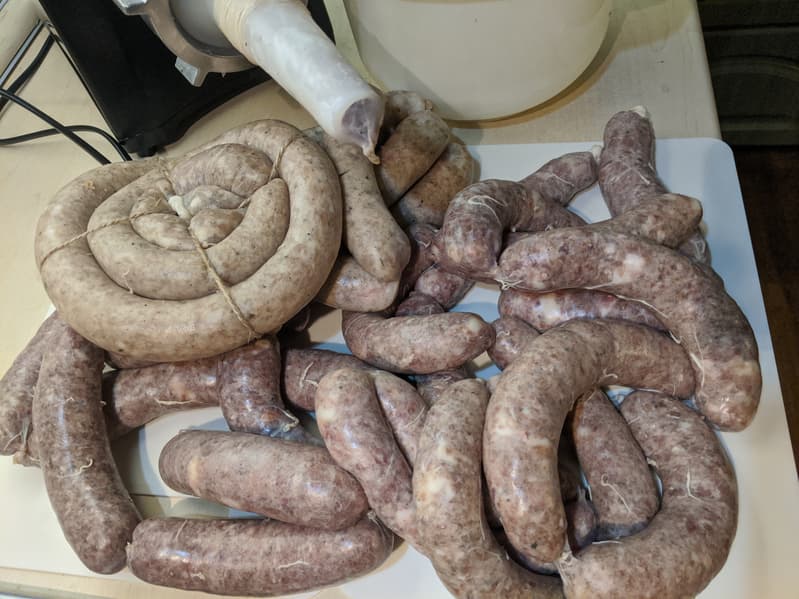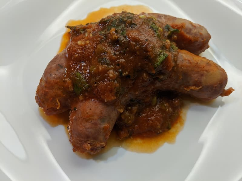 Результат, тем не менее, оказался отличным: за непродолжительное время и без особенных усилий нам удалось изготовить почти четыре килограмма домашних колбас. Часть мы отложили для жарки на следующий день, часть завакуумировали, поместили в су-вид на пару часов при температуре 70 °C (обработанные таким образом колбасы сохраняют при хранении в холодильнике свежесть и вкусовые качества в течении трех-четырех недель), а часть потушили в томатном соусе с чесноком и зеленью.