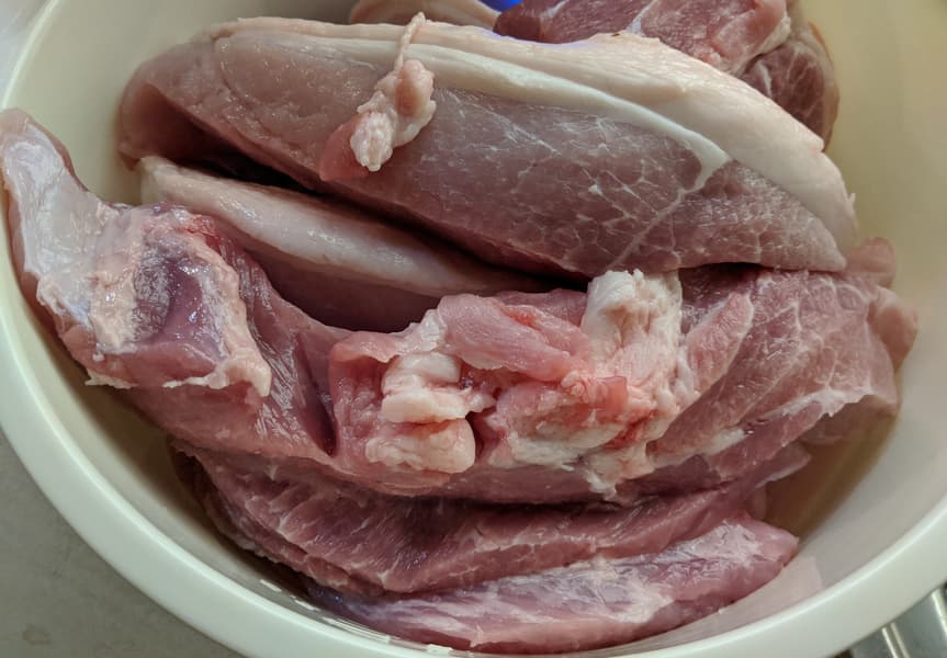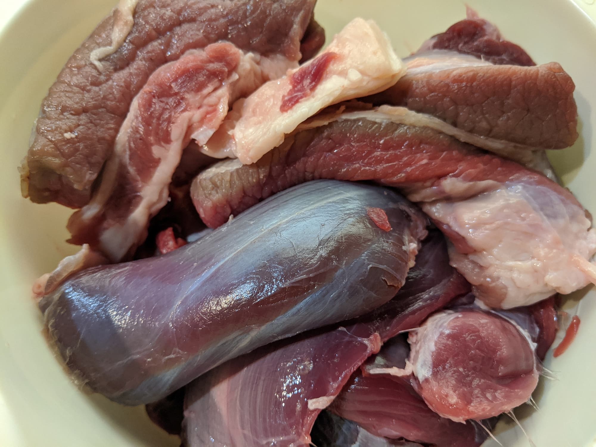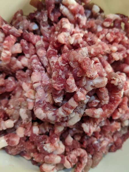 Для следующего теста мы взяли жилистую и довольно жирную говядину, не подвергавшуюся заморозке — примерно поровну мякоти от голяшки и грудинки. Мы срезали наиболее крупные сухожилия и пленки и нарезали на куски, свободно проходящие в горловину мясорубки. Как и в прошлом тесте, мы использовали среднюю решетку.