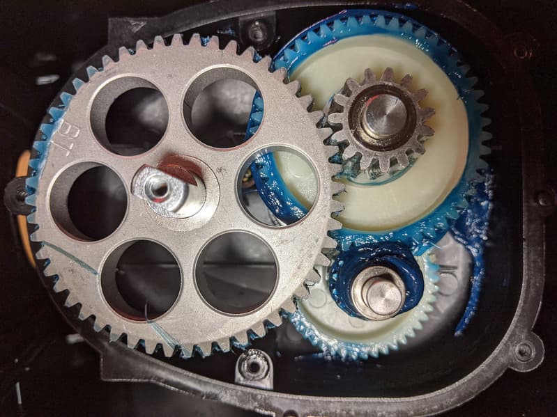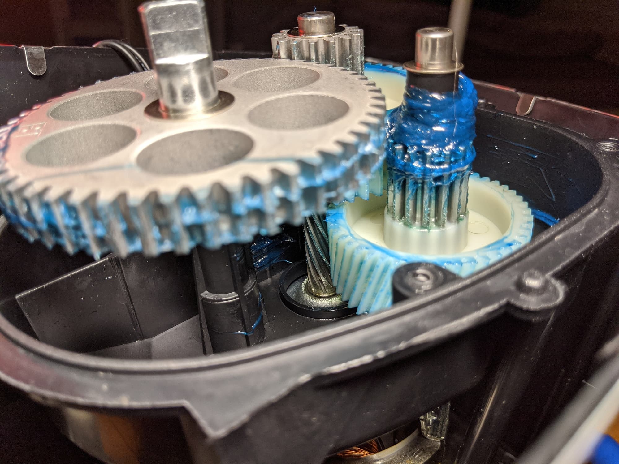 Первое, ведущее, колесо редуктора — косозубое пластиковое, принимающее вращение с металлического моторного вала. Вторая зубчатая пара — прямозубая, с металла на пластик, третья же — прямозубая металл/металл. Соединения «пластик/пластик» в редукторе не используются. Смазки в редукторе достаточно, заметных излишков нет.