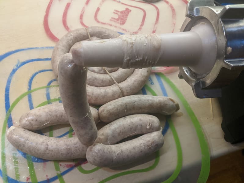 Для изготовления домашних колбас и сосисок мы приготовили смесь из свиного и говяжьего фарша, добавили кубики соленого свиного сала, пряности и соль, присоединили к мясорубке насадку для набивки колбасок и натянули на нее натуральную колбасную оболочку.