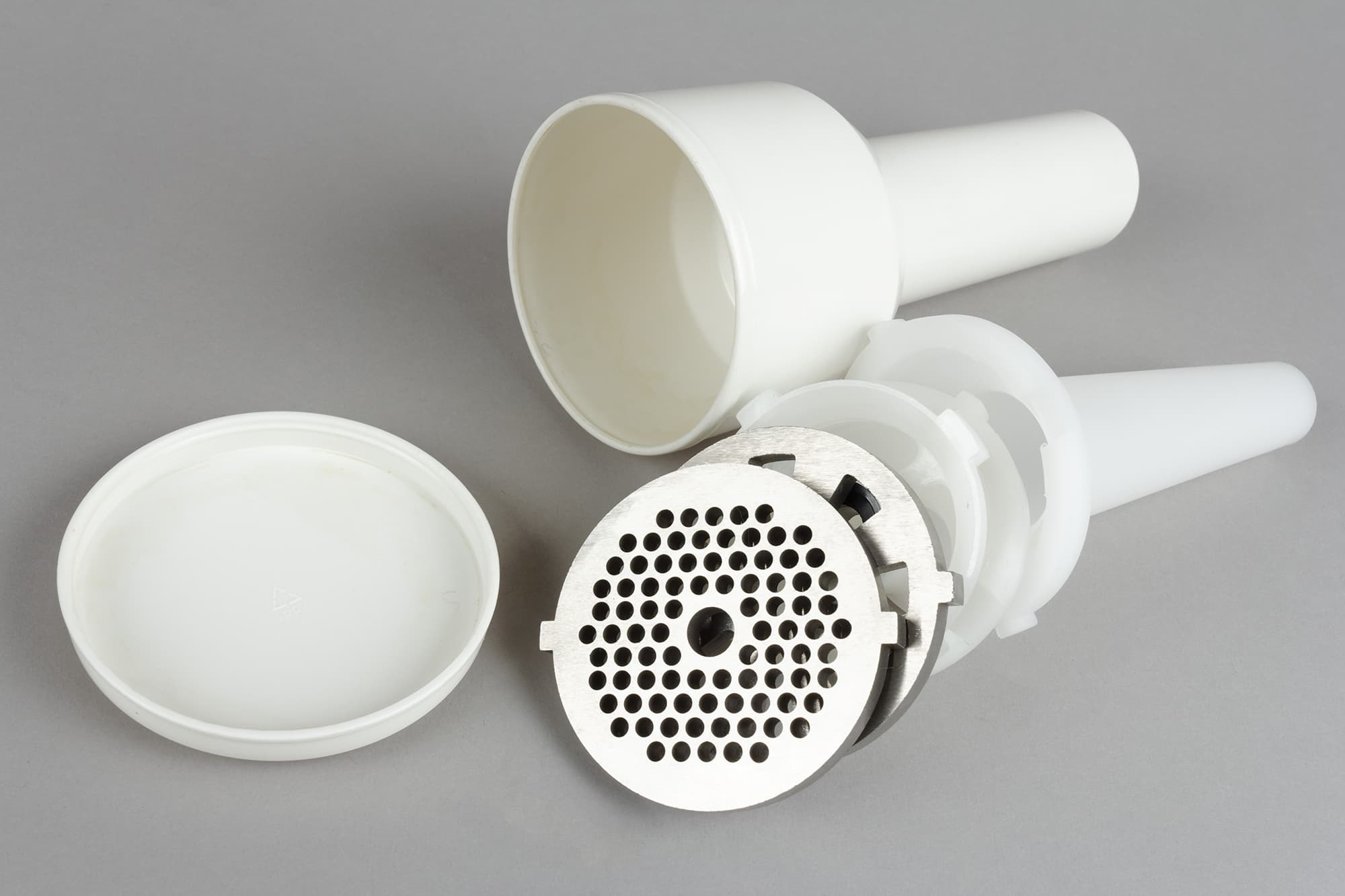 Также в комплект мясорубки входят пластиковые насадки — комплект для изготовления кеббе и коническая трубка для набивки колбасных изделий.