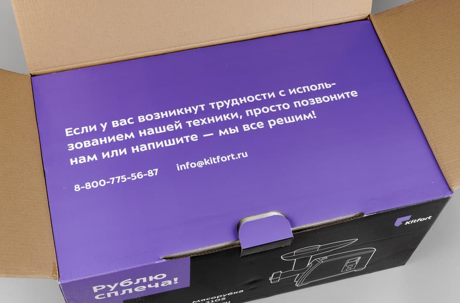 На внутреннем клапане коробки мы видим традиционную для компании Kitfort контактную информацию службы технической поддержки с любезным предложением обращаться к ним в случае трудностей.