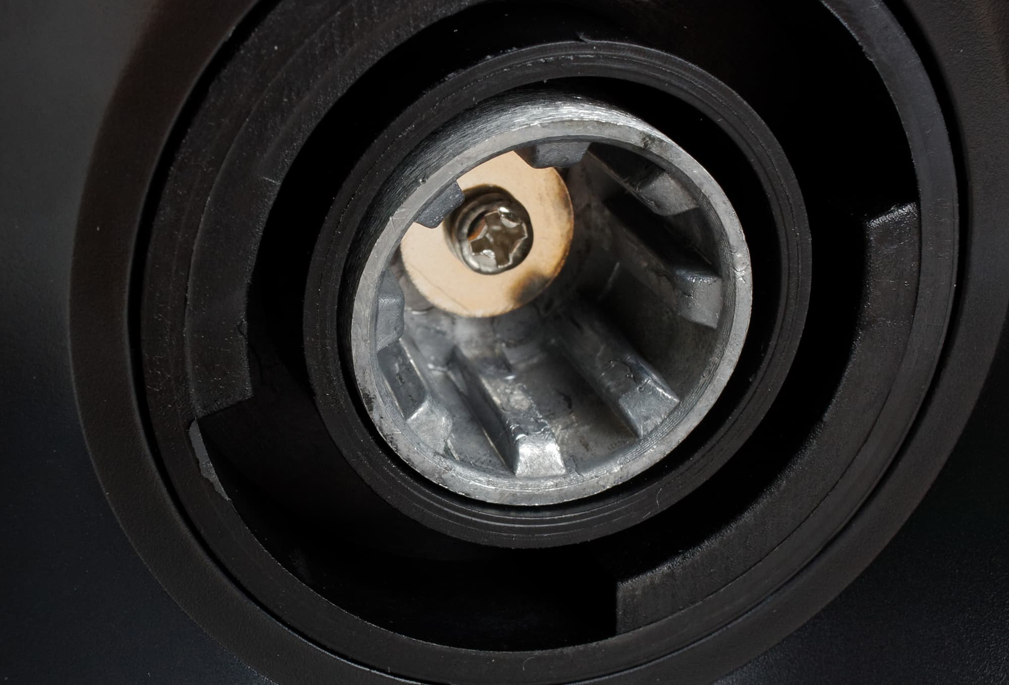 На передней стенке моторного блока размещен байонет крепления мясорубки: он традиционной формы и конструкции: мясорубка вставляется в него под углом в 40° и поворачивается до вертикального положения. Материал соединения приводного вала и шнека мясорубки — металл/металл.