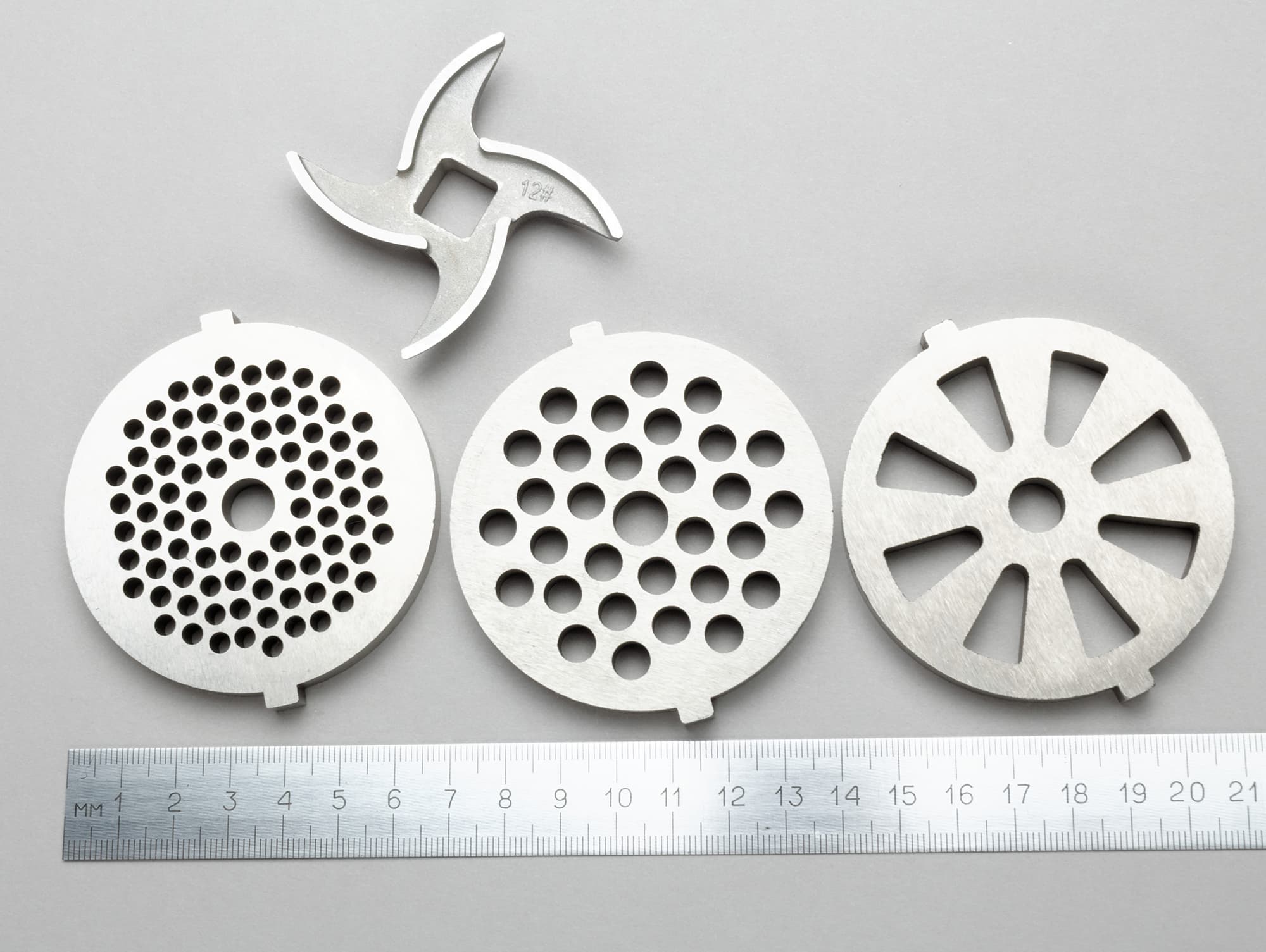Нож и решетки, разумеется, стальные, хорошо отполированные, с едва заметными следами обработки. В комплекте с мясорубкой Kitfort KT-2105 идут три решетки: две с круглыми отверстиями диаметром 4 и 7 мм и одна — с большими трапециевидными отверстиями. Диаметр решеток — 68 мм, толщина — 7 мм.