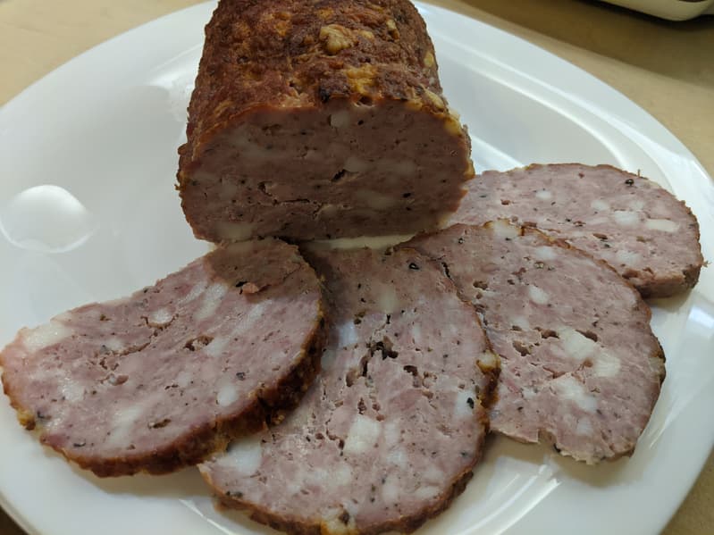 Фарш из первого и второго теста мы смешали, добавив мелко нарубленное свиное сало, пряности и соль, хорошо вымесили полученную смесь до тех пор, пока она не перестала липнуть к рукам, дали ей отлежаться несколько часов в холодильнике, поместили ее в форму, а форму — в духовку на 180 °C. Когда температура внутри фарша достигла 72 °C, мы чуть прибавили огонь и пару раз в течении последующих десяти минут поливали верх нашего колбасного хлеба образовавшимся соком, затем дали ему остыть.