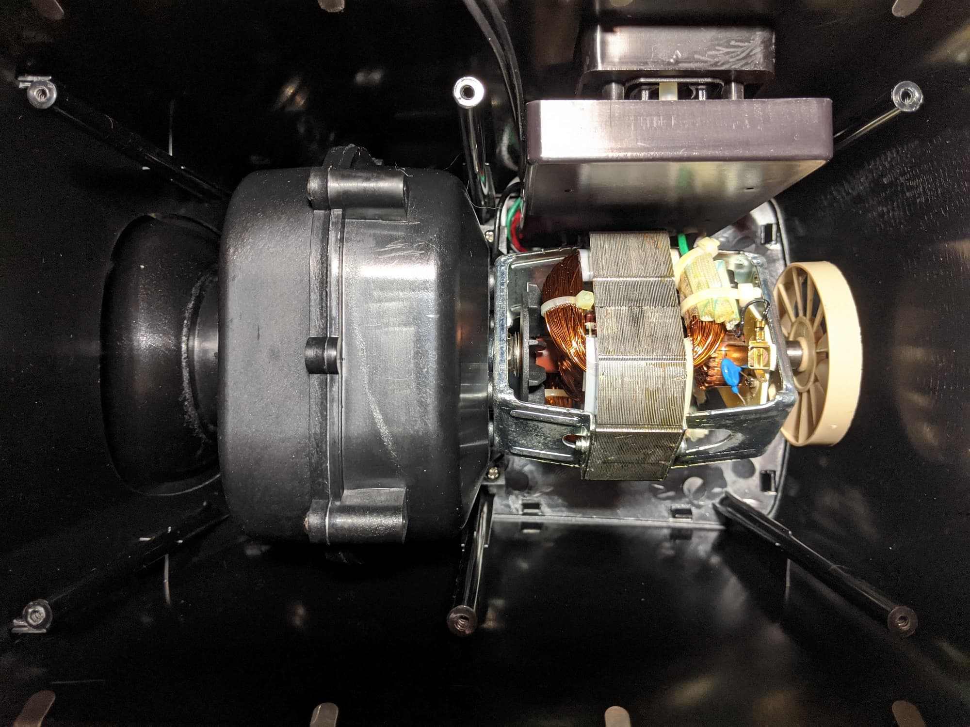 После внешнего осмотра мы разобрали моторный блок и изучили его изнутри. Мотор с вентилятором и редуктором закреплены на верхней крышке корпуса четырьмя винтами, имея пятую точку опоры в виде отверстия для крепления шнека.