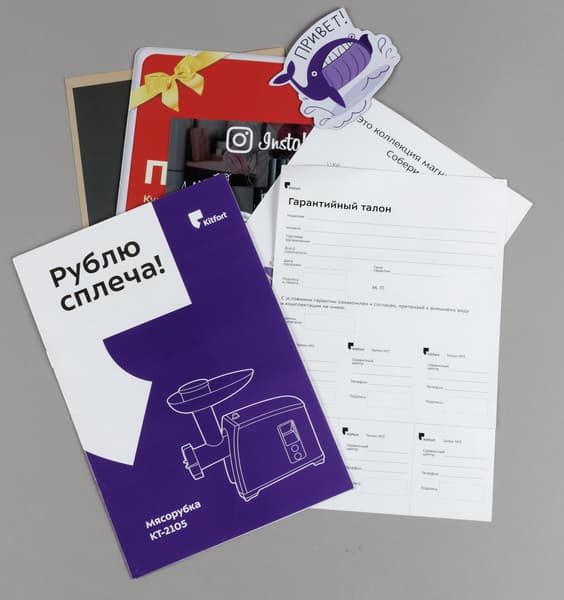 Внутри все так же расставлено по порядку: информация о горячей линии Kitfort, куда надо звонить и писать по всем вопросам, связанным с техникой компании, оглавление. Затем идут общие сведения о мясорубке — тут мы узнаем, что у нее 1 скорость работы и реверс, а также что в толкателе, который является контейнером с крышкой, можно хранить насадки.