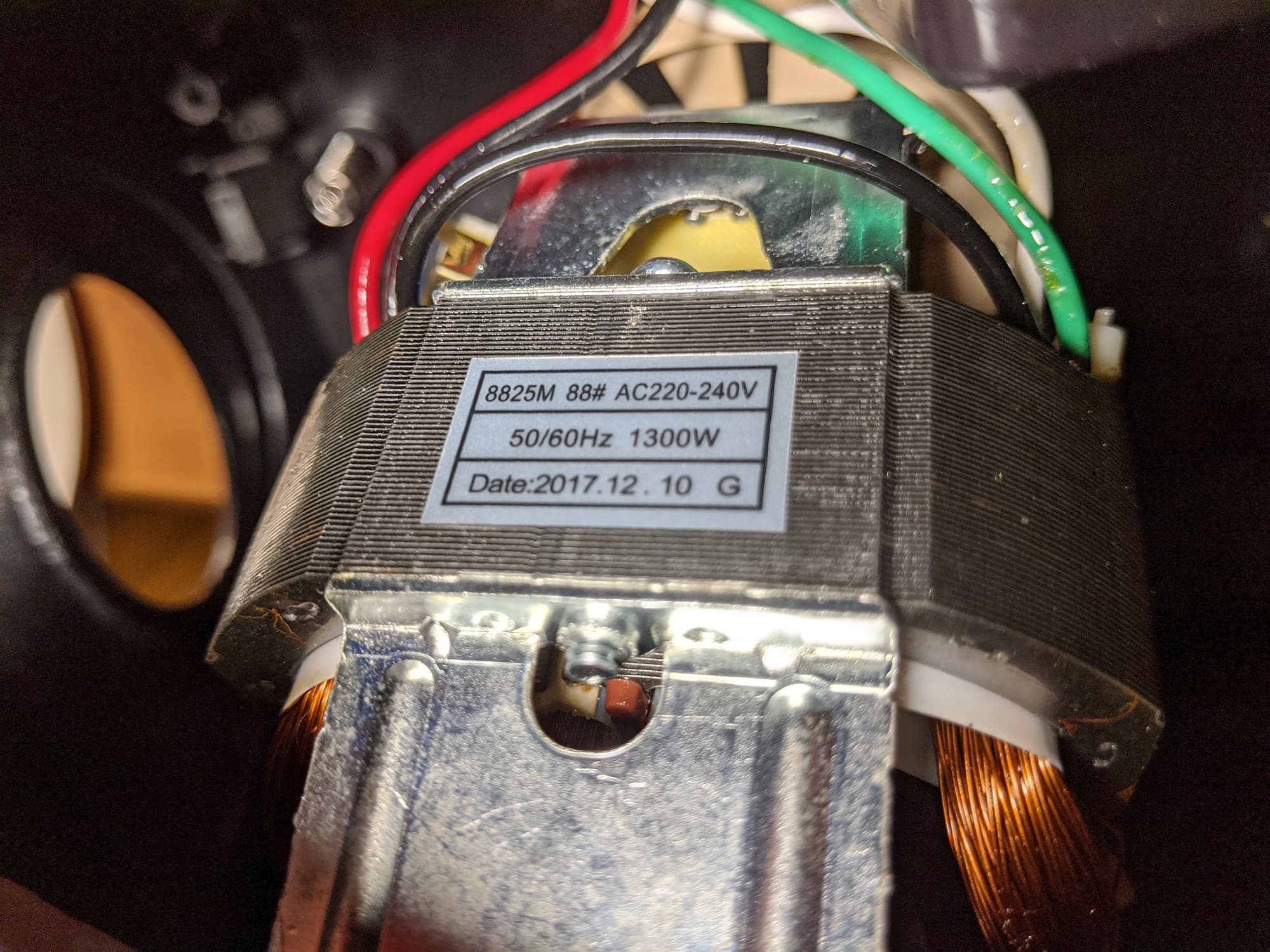 По многочисленным просьбам читателей мы публикуем также фотографию маркировки мотора: в нашем случае это весьма распространенный в бытовой технике 8825M, маркировка мощности которого (1300W) соответствует заявленной производителем номинальной мощности мясорубки.