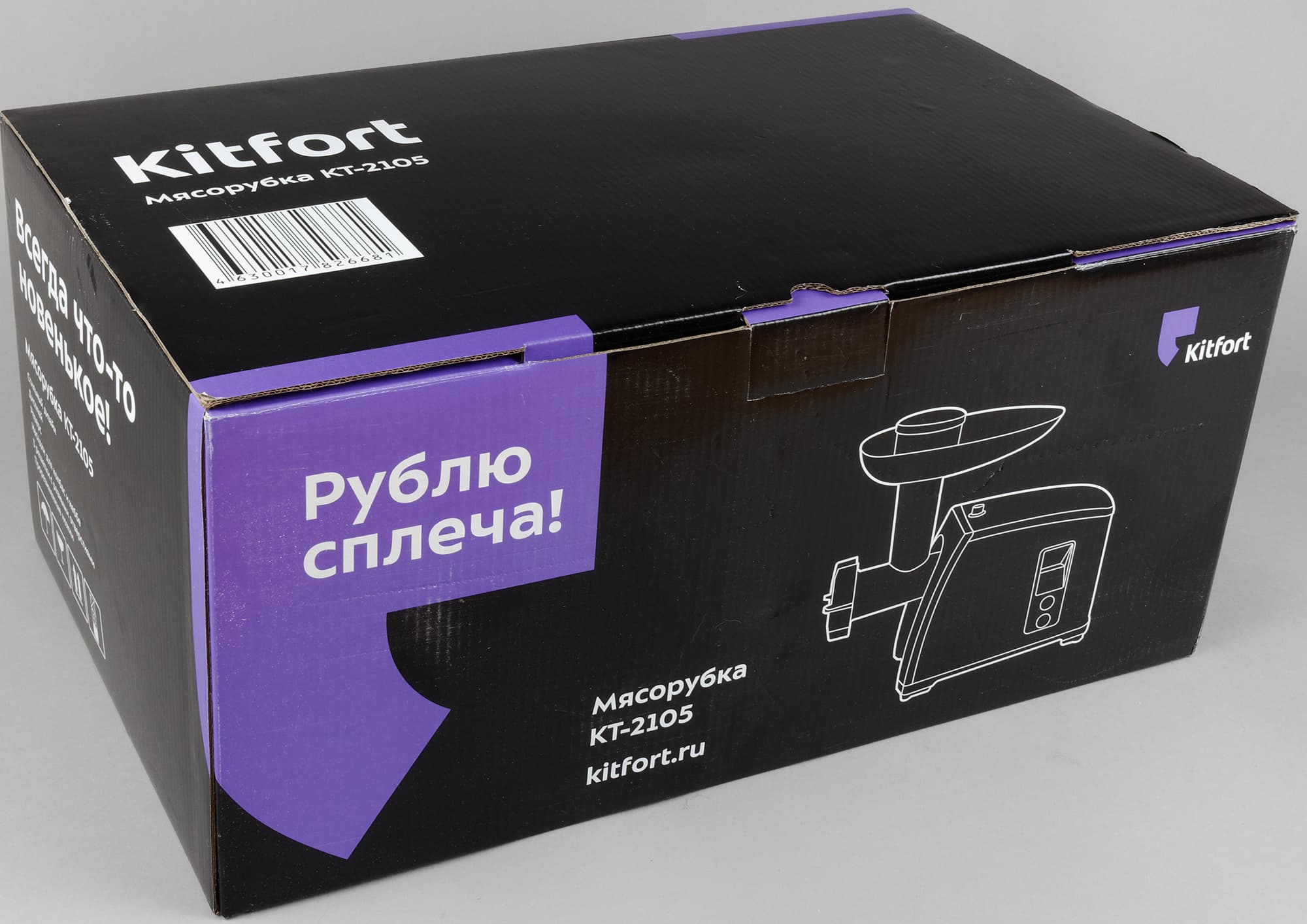 Черная картонная коробка с фиолетовыми вставками и белым шрифтом достаточно лаконична. Две широкие стороны идентичны и содержат название и марку бытового прибора, адрес сайта компании Kitfort, схематическое изображение мясорубки и слоган «Рублю сплеча!».