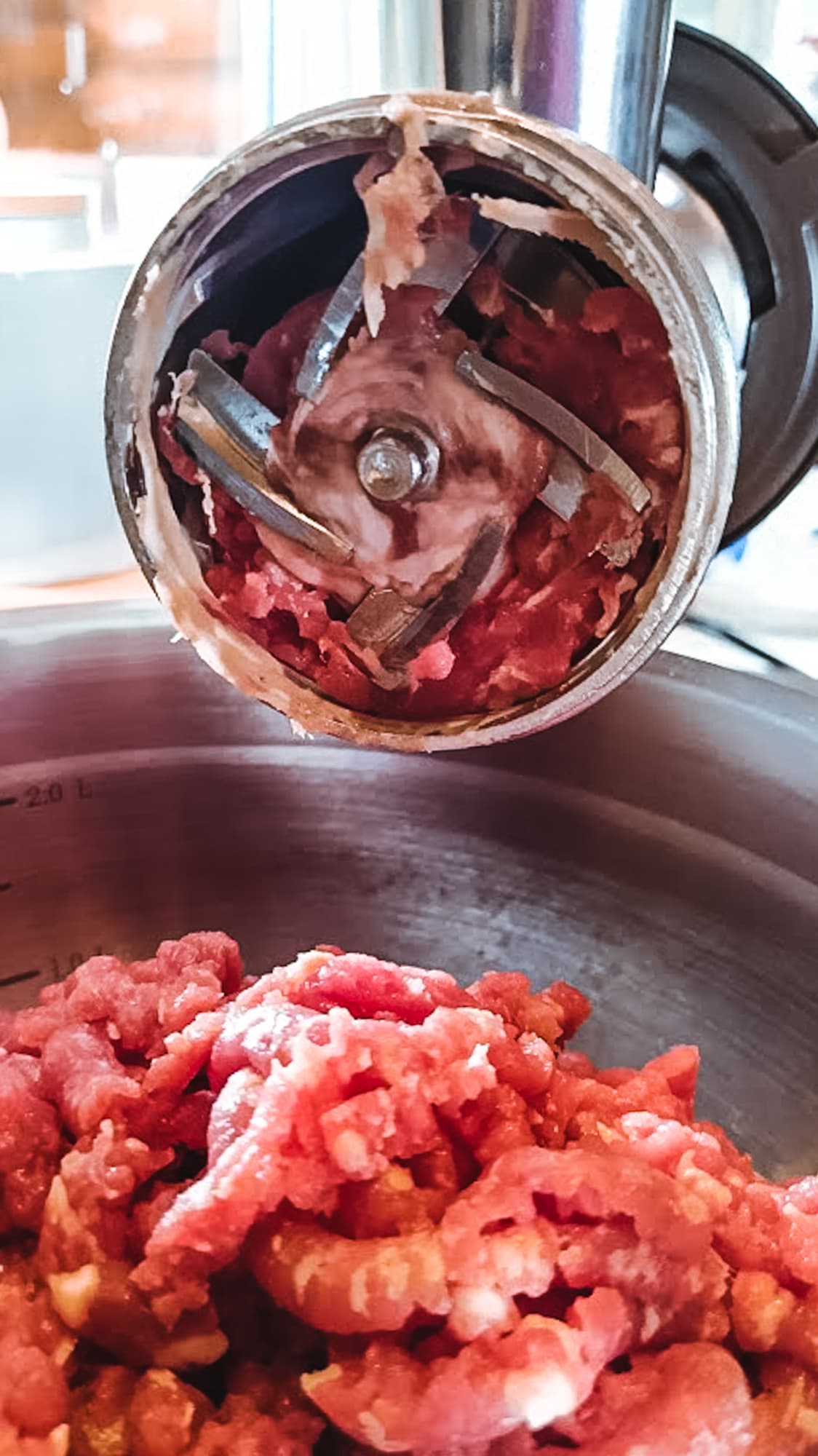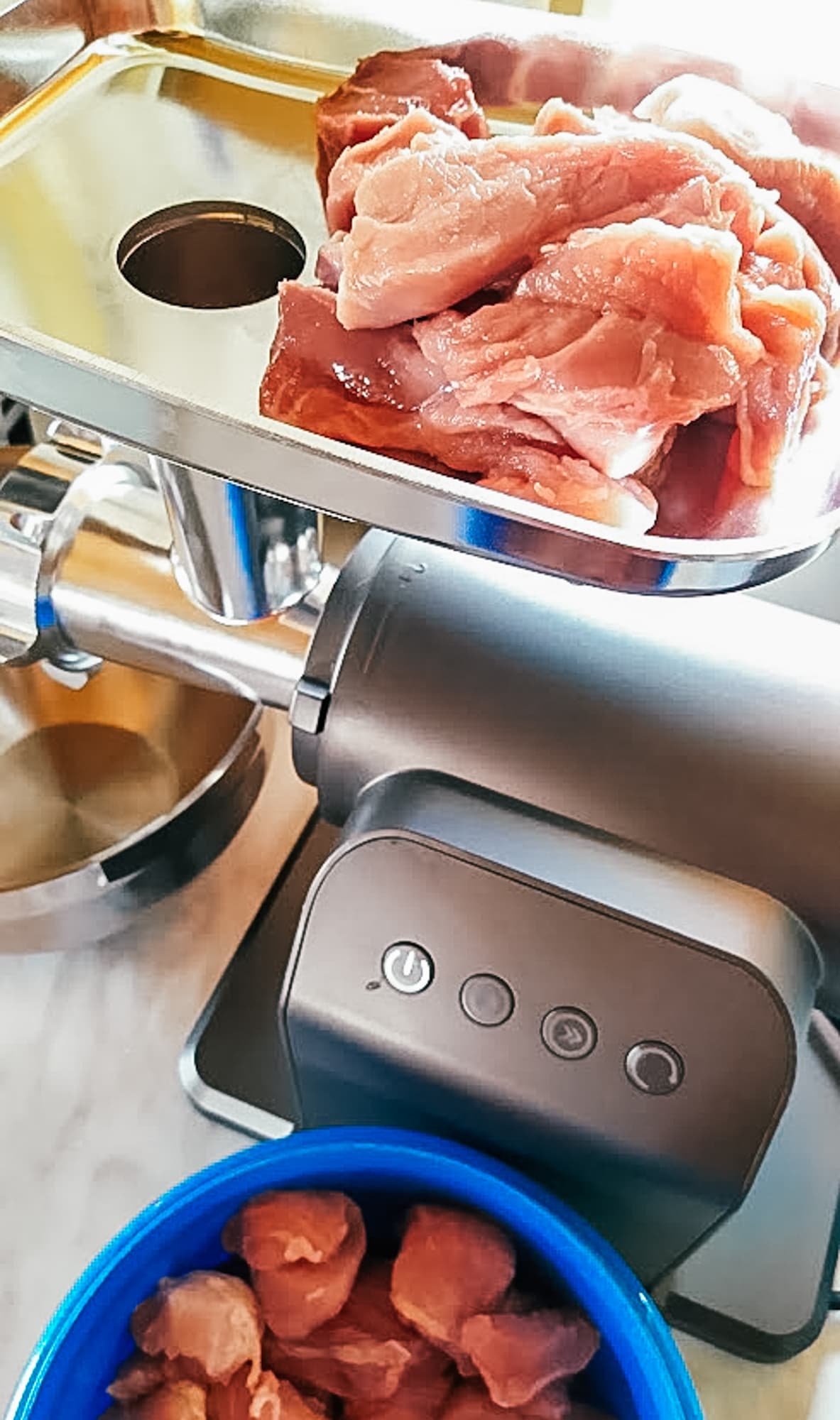 1,5 кг свинины мы нарезали на небольшие кусочки, проходящие в горловину, и приступили к работе на второй скорости. Мясо было переработано за 90 секунд.
