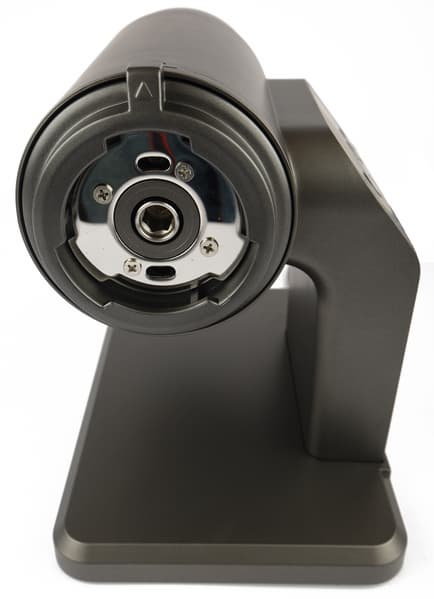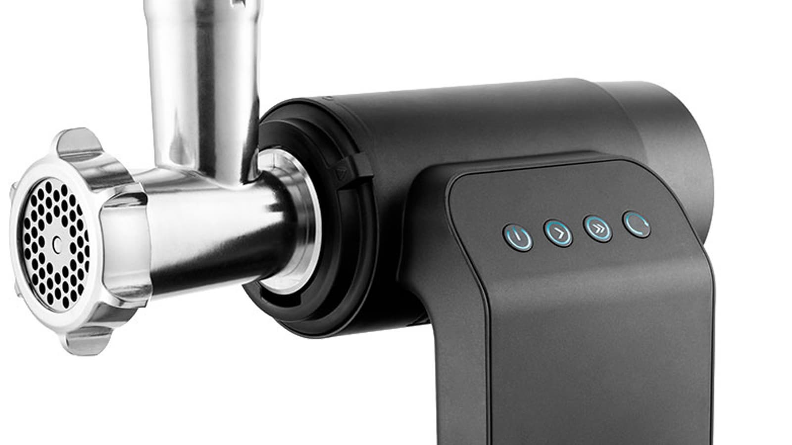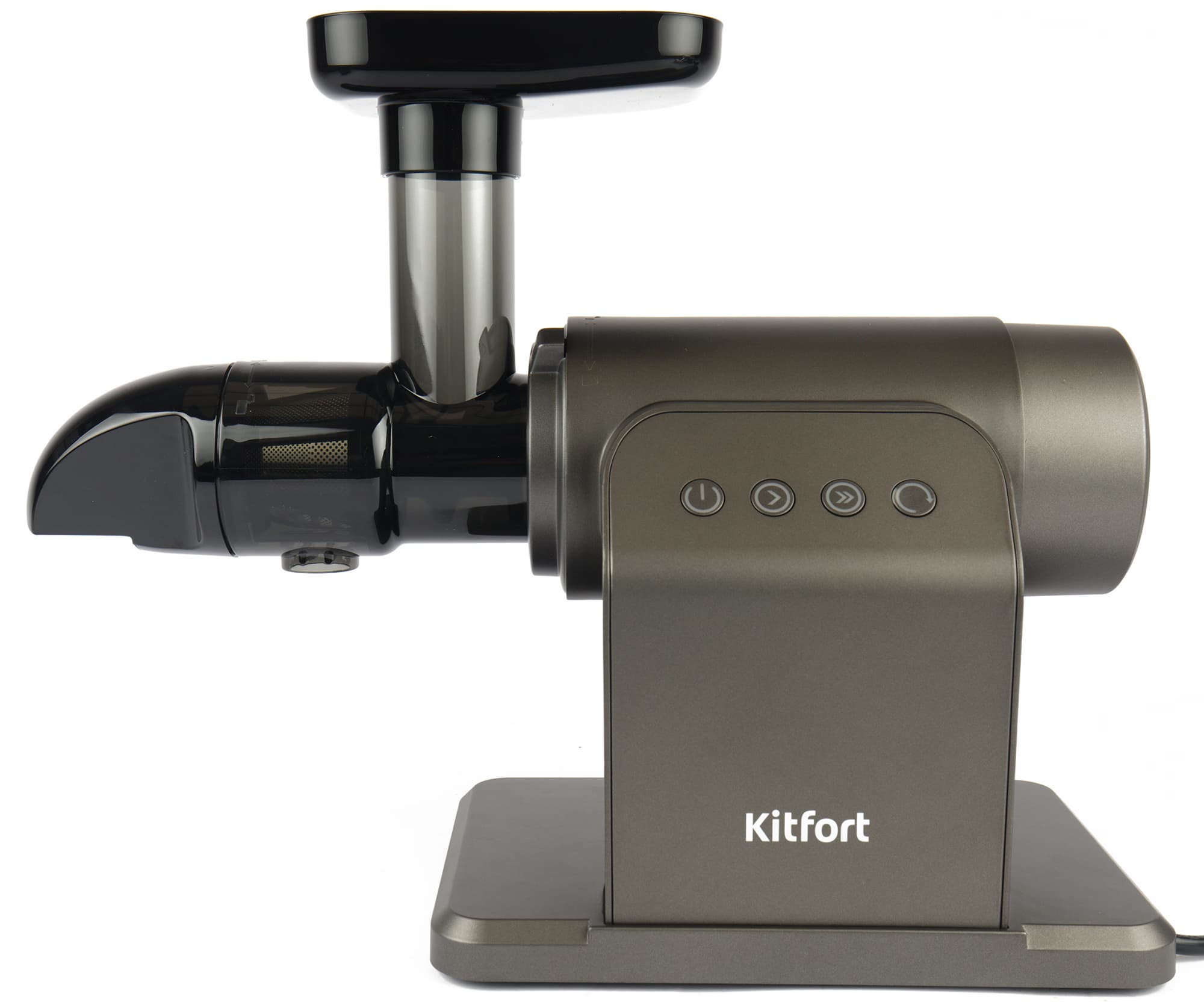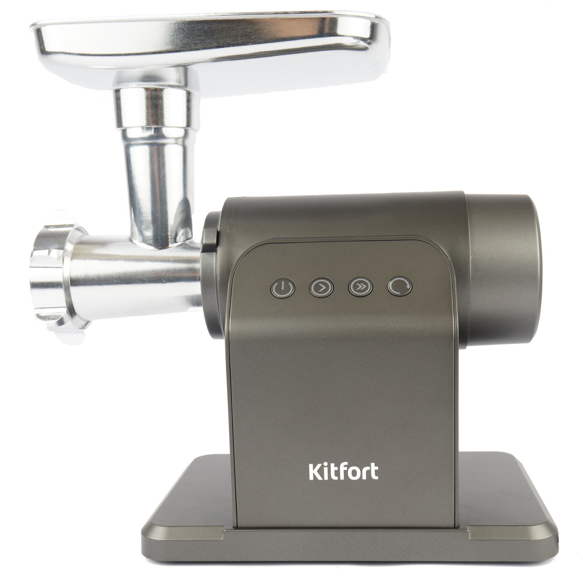 Якобы черный, но больше похожий на темно-серый корпус мясорубки Kitfort KT-2109 привлекает внимание своей необычной формой. Из прямоугольного основания поднимается изогнутая «ножка», на ней расположена панель управления. К ножке прикреплен цилиндрический моторный блок. Корпус невелик, благодаря оригинальной конструкции для него легко найти место даже на небольшой кухне.