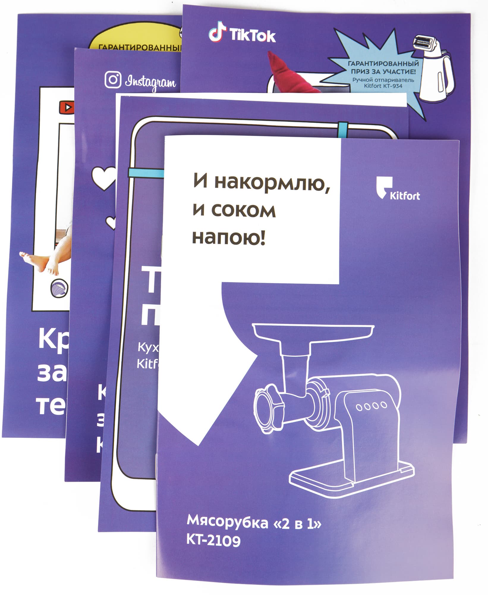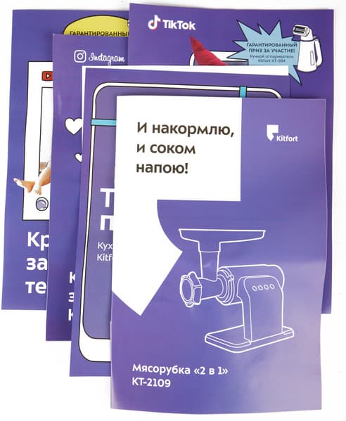 Руководство об эксплуатации — стандартная для Kitfort брошюра в бело-фиолетовой обложке с изображением прибора. Первым идет раздел «Общие сведения», и по нему создается впечатление, что производитель считает KT-2109 скорее соковыжималкой, нежели мясорубкой: 90% главы посвящено описанию шнековой соковыжималки и ее преимуществам перед центробежной. Но следующие шесть страниц отведены уже под описание работы мясорубки. Инструкция написана очень подробно и дополнена множеством иллюстраций. Советы по работе с соковыжималкой тоже исчерпывающие.