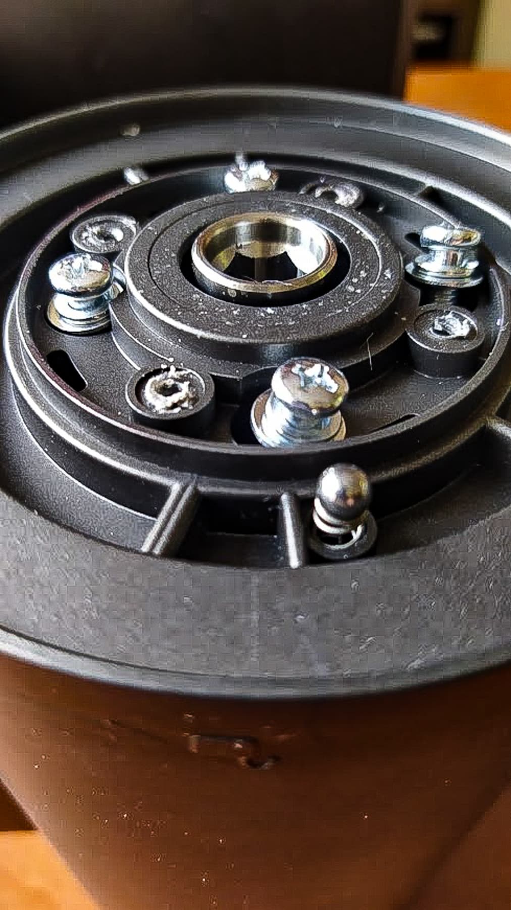 Чтобы подобраться к внутренностям Kitfort KT-2109, нам пришлось преодолеть несколько рядов саморезов и болтов, но обошлись мы одной крестовой отверткой. Первые 4 шурупа оказались вкручены в пластик, и процесс их извлечения явно материалу не понравился — края отверстий раскрошились.