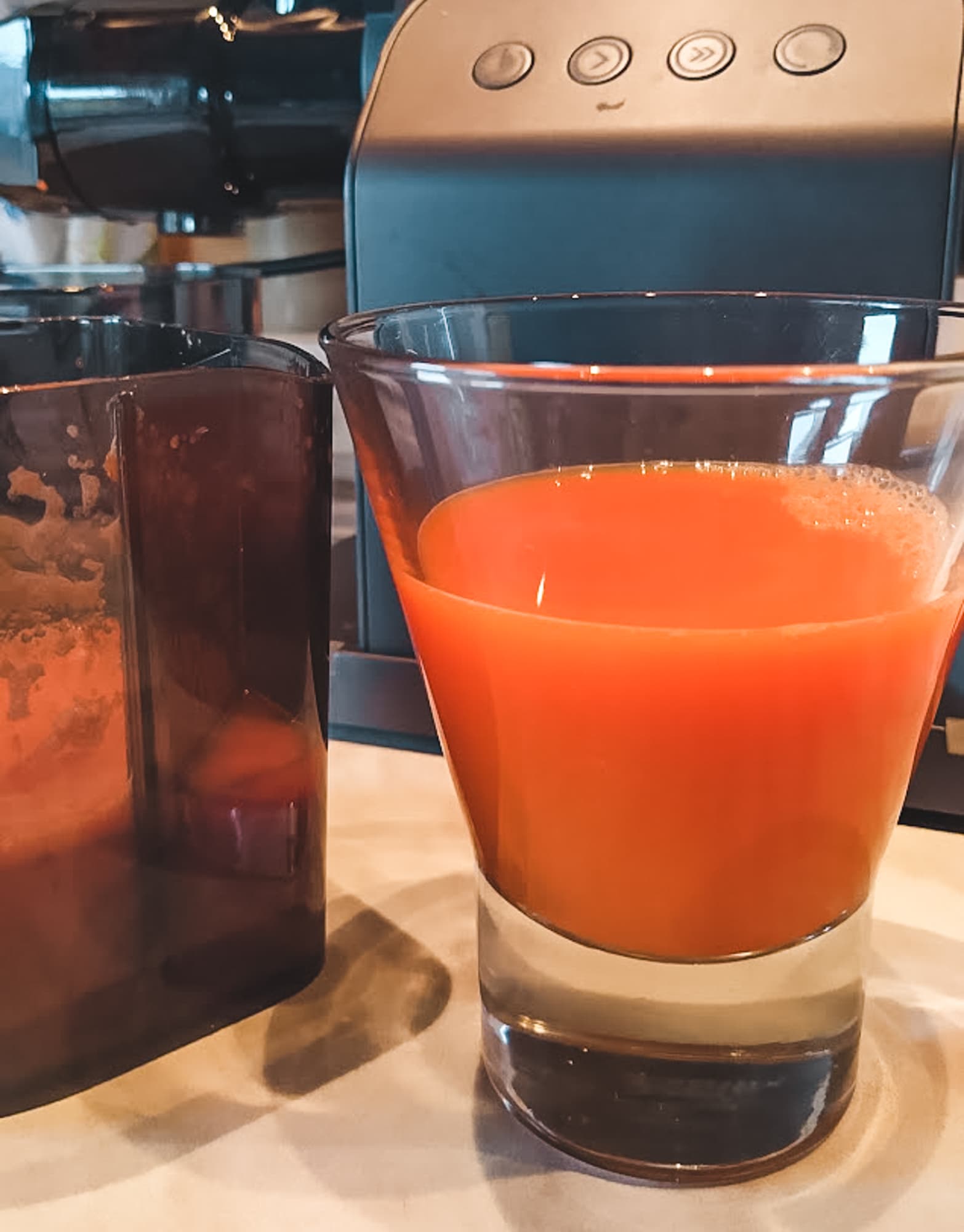 Сок был отжат ровно за 3 минуты, вес его — 532 грамма. Пены минимум. Жмых чуть влажный, и его вышло очень много — пришлось один раз освободить контейнер.