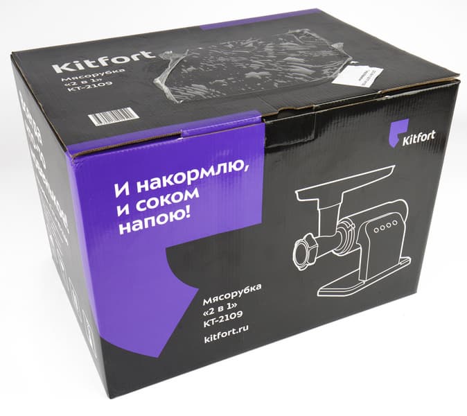 Взглянув на коробку, по характерному оформлению можно сразу понять, что внутри — творение компании Kitfort: на черном фоне векторное изображение прибора, в левом верхнем углу — фиолетовая вставка со слоганом, сообщающим пользователю, что мясорубка оснащена насадкой-соковыжималкой.