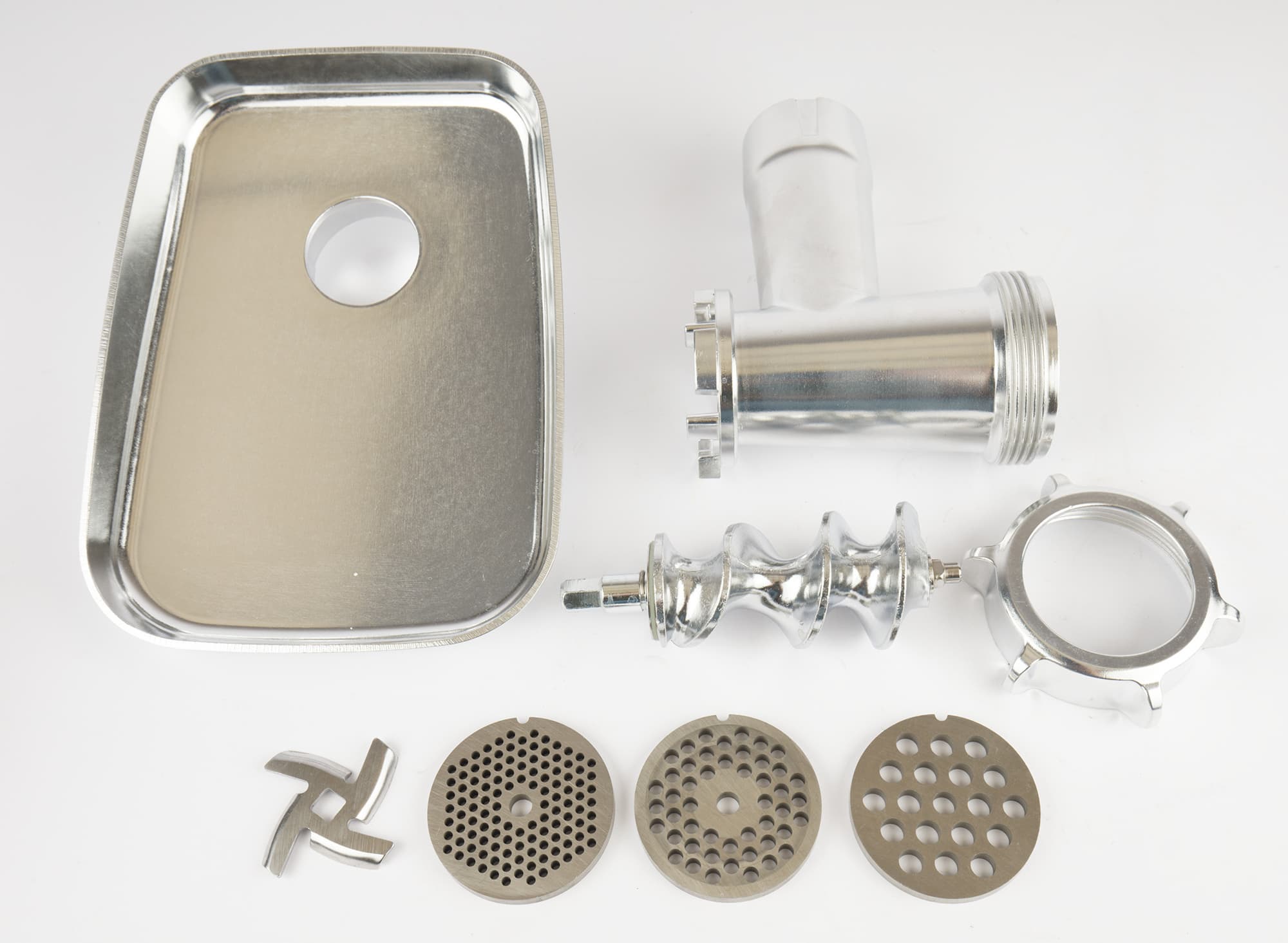 Мясорубочная часть прибора стандартная: силуминовая горловина, шнек, несколько стальных решеток, нож и кольцевая гайка. Все элементы выполнены аккуратно, без следов шлифовки, отливки или облоя, и соединяются на раз-два, крепко завинченная гайка легко снимается благодаря упорам.