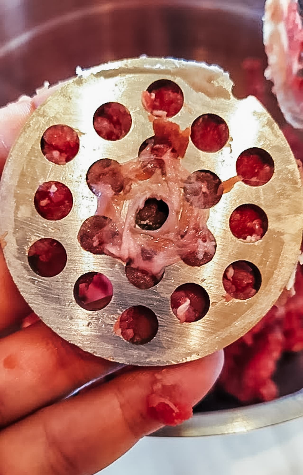 Из центра решетки торчали шматки мяса, которые так и не перемололись. Так что мы открутили гайку и посмотрели, что мешало процессу.