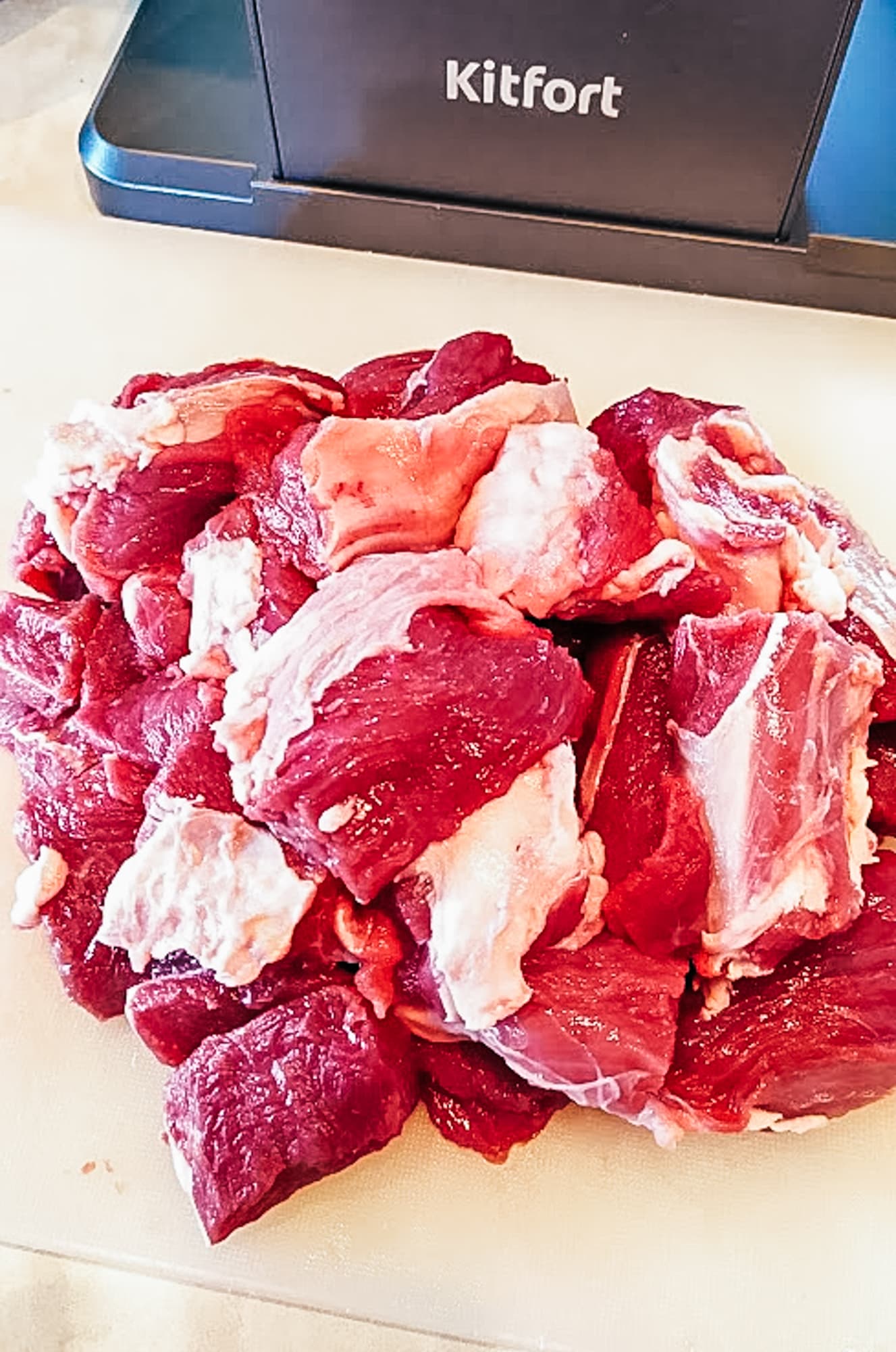 На очереди тяжелое испытание — килограмм жилистого говяжьего подбедерка. Узнав, что мы собираемся совать это в мясорубку, мясник сделал круглые глаза и хотел было отрезать особенно проблемные жилы, но мы решительно отказались от этой услуги. Если проверять Kitfort KT-2109 на прочность, то по полной.