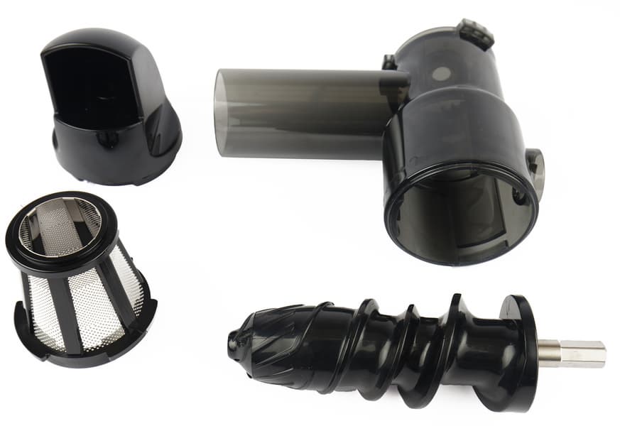 Загрузочный блок соковыжималки выглядит внушительно, но фильтр довольно миниатюрный — осенний урожай яблок, видимо, придется перерабатывать очень долго. Тем более горловина тоже узкая — пролезет только четвертинка небольшого яблока. А вот шнек похож на элемент буровой установки. Отверстие для сока находится в нижней части загрузочного блока, а для вылетающего жмыха предназначена насадка-крышка, надевающаяся на отжимной блок спереди.