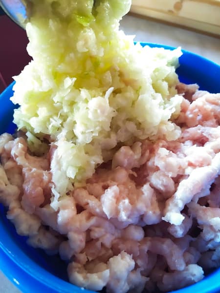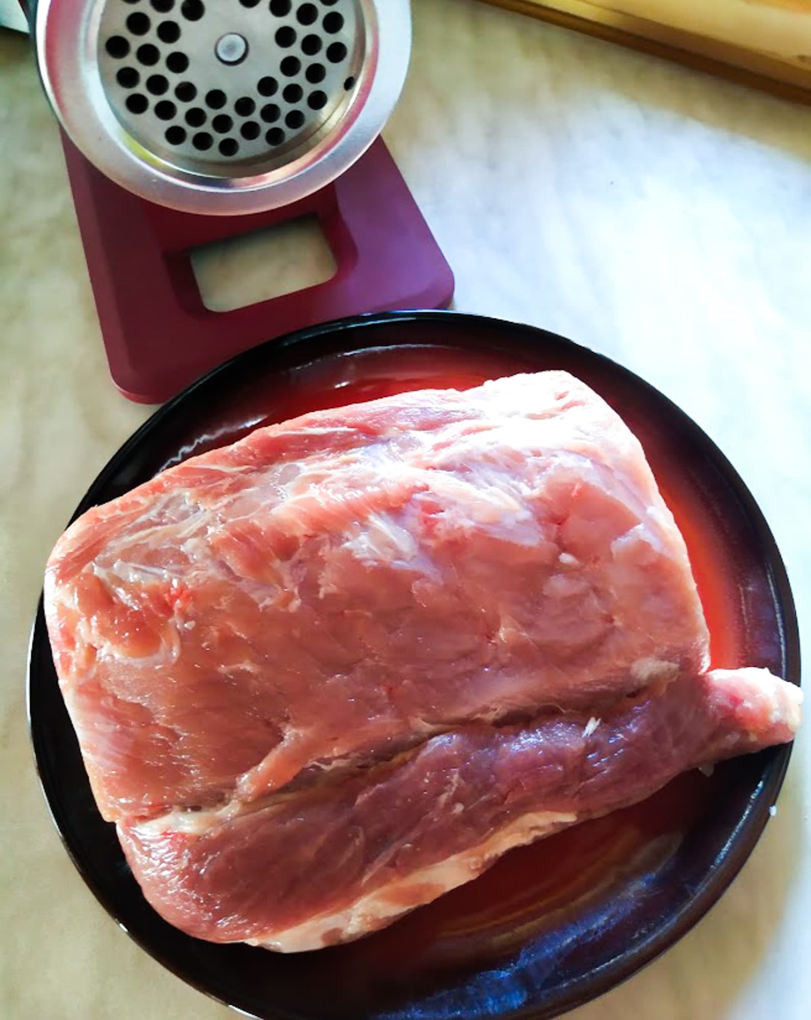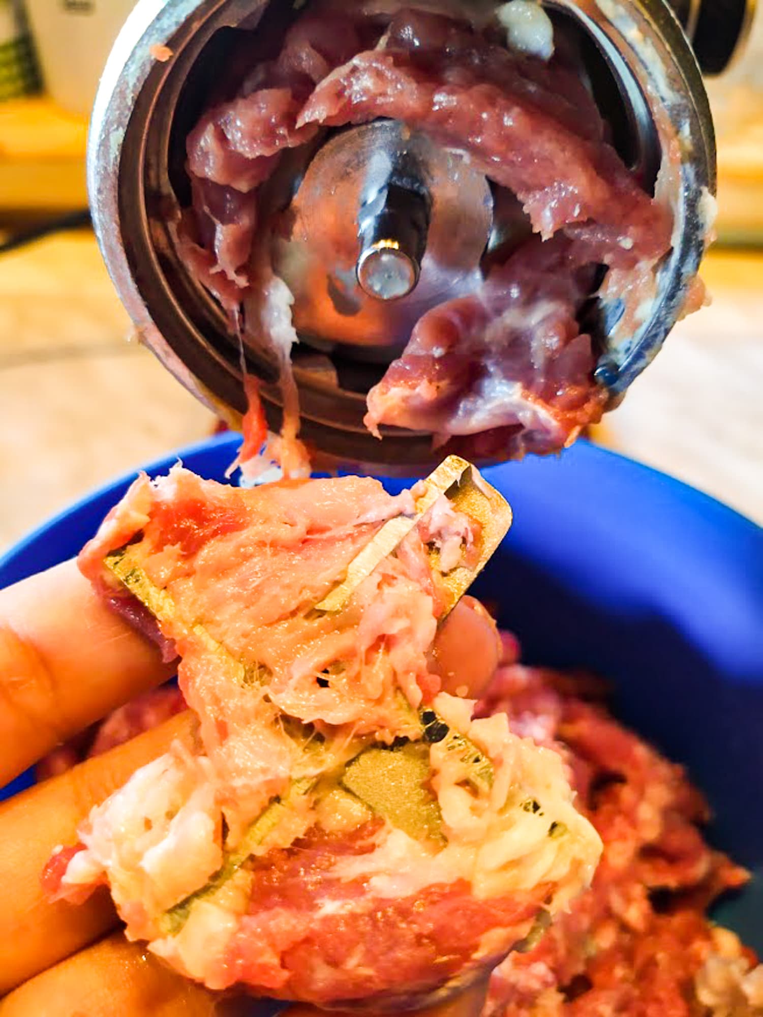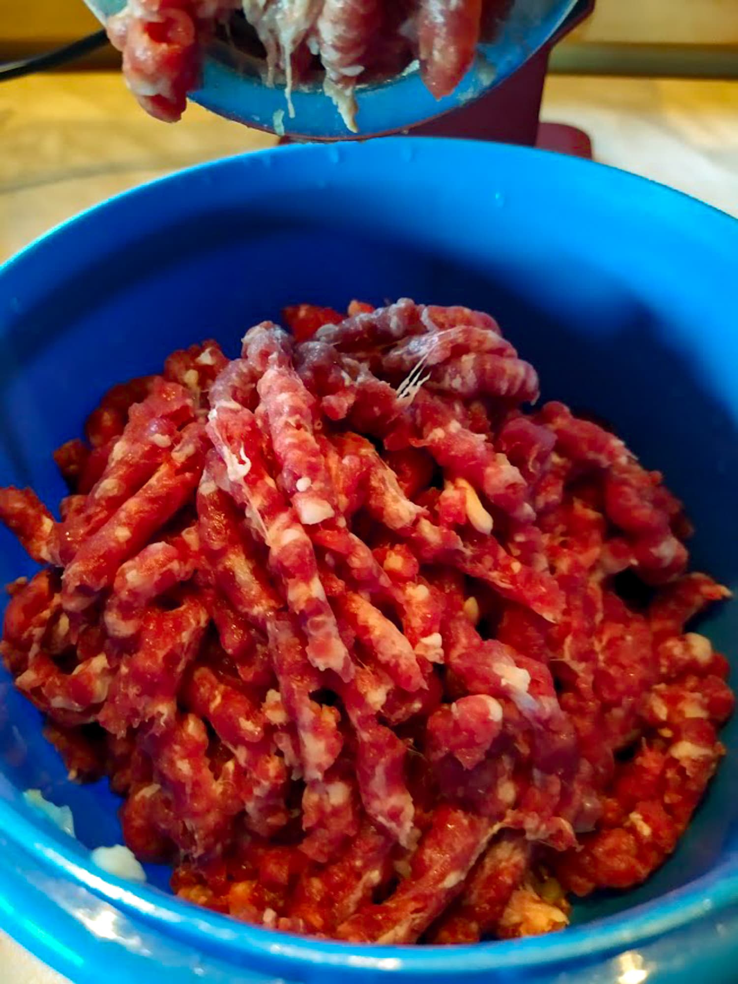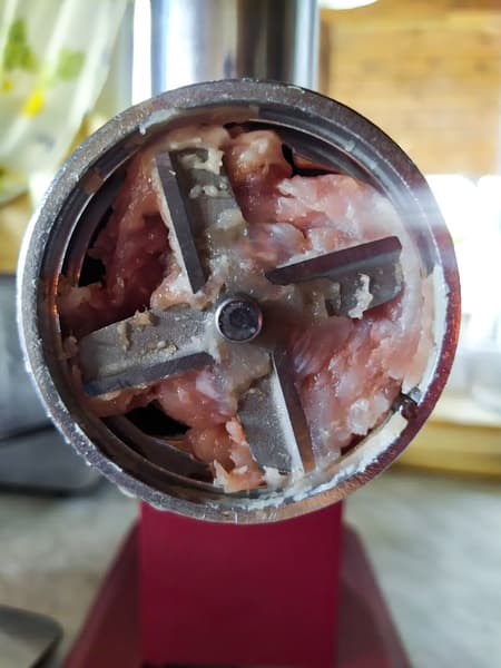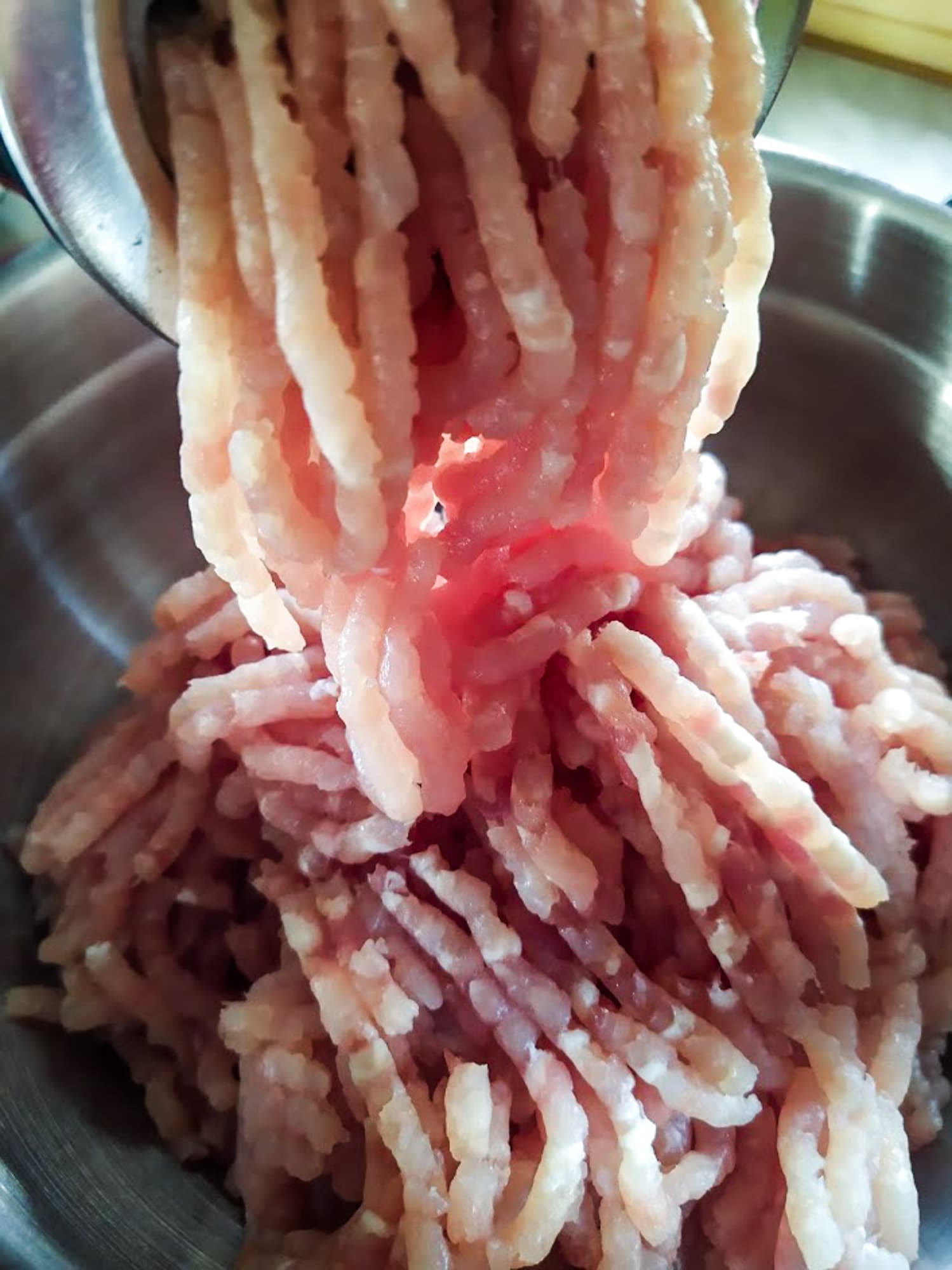1200 граммов филе грудки индейки и 300 граммов свиного жира проскочили через мясорубку за полторы минуты.