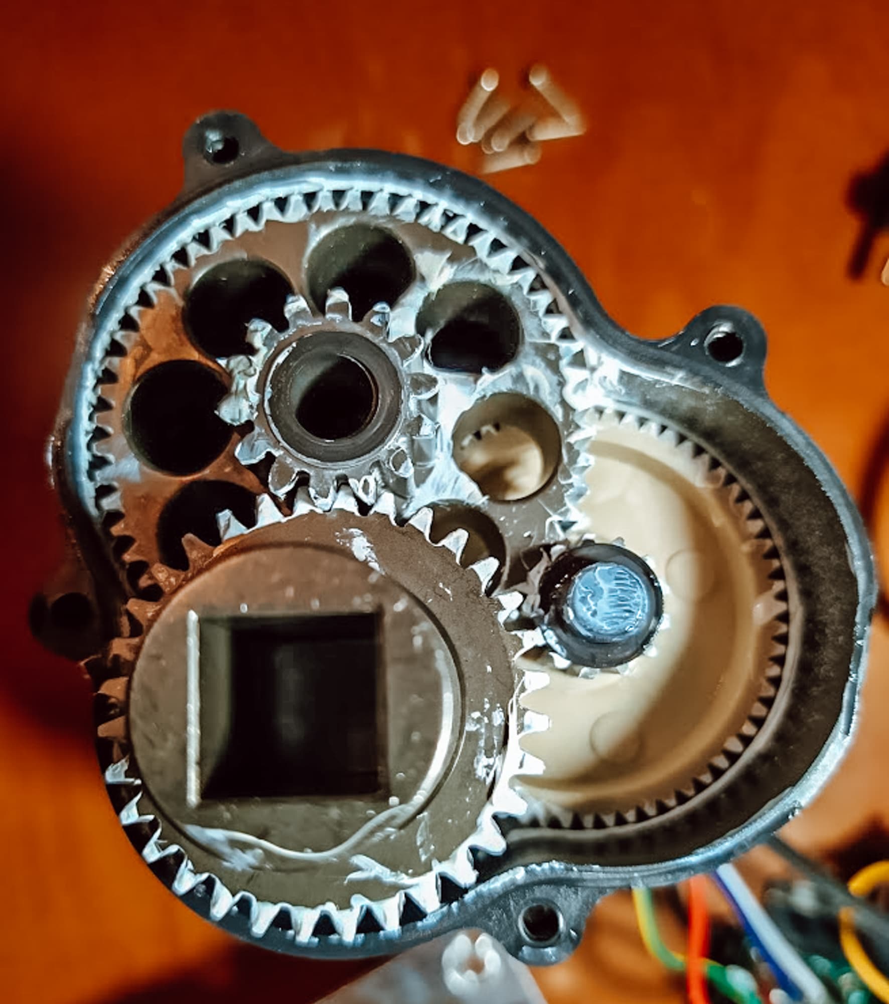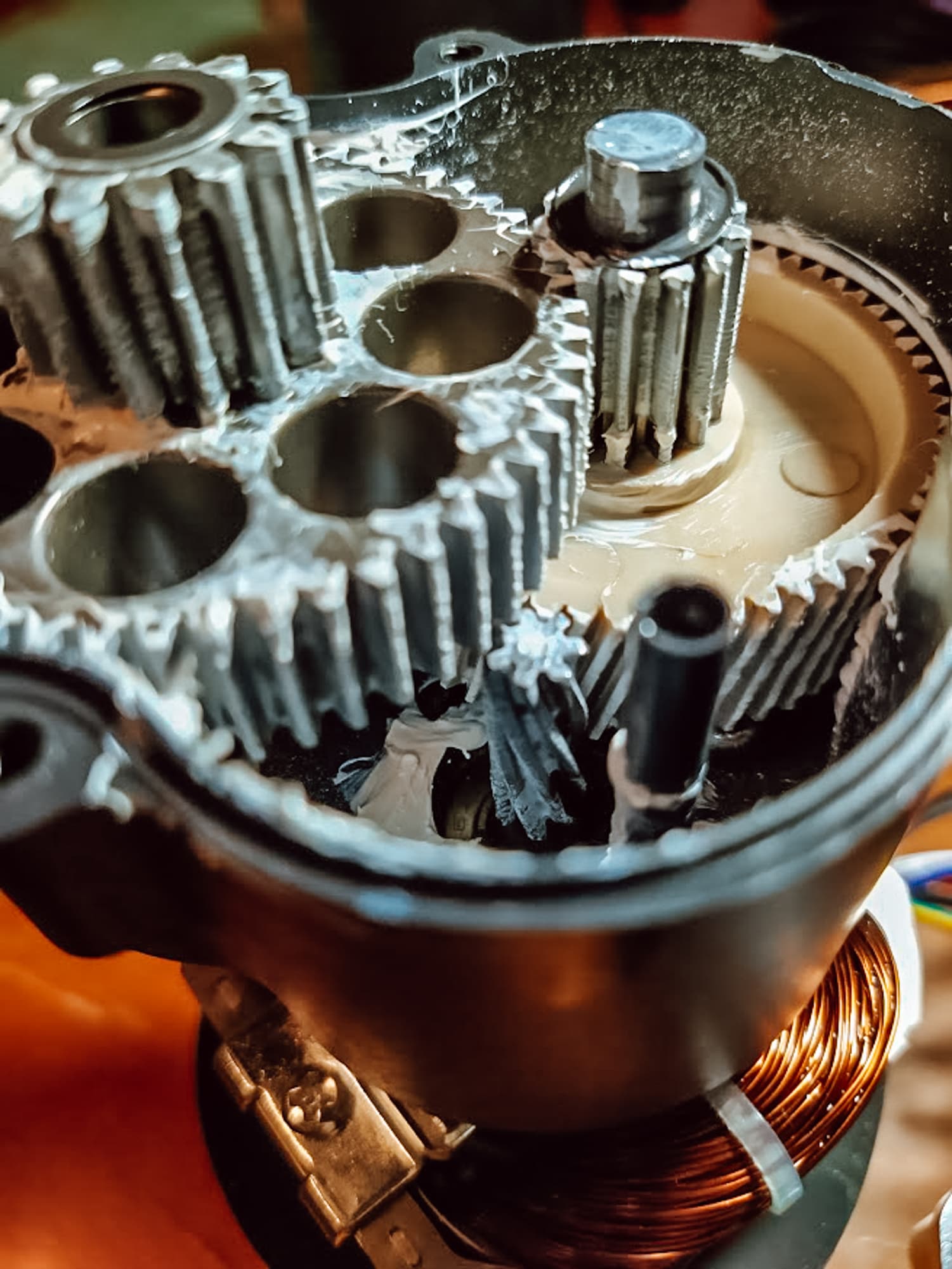 В редукторе мы обнаружили пять шестерней. Ведущая — косозубая пластиковая, она принимает вращение с металлического моторного вала.