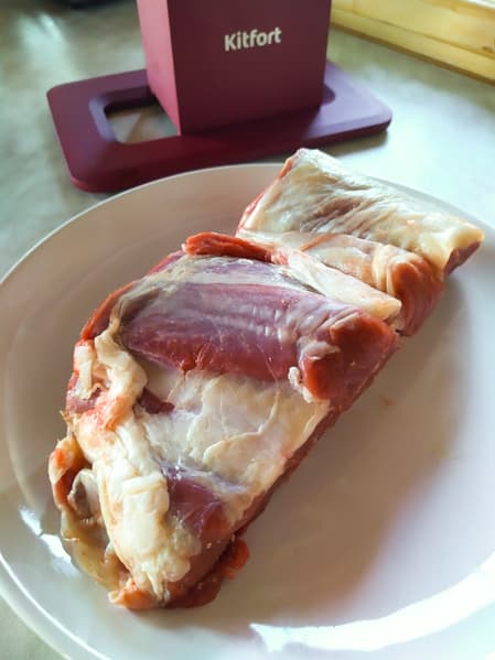Каждый раз перед описанием этого теста хочется вставить дисклеймер: трюк выполнен профессионалами, не пытайтесь повторить его! И правда, такому жилистому куску подбедерка лучше оказаться в холодце, а не в мясорубке, но с его помощью мы попытаемся определить границы возможностей KT-2110-1.
