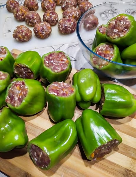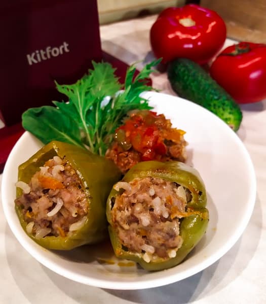Полученный в ходе двух первых тестов фарш мы перемешали, добавили лука, моркови, риса и приготовили тефтели и фаршированный перец.