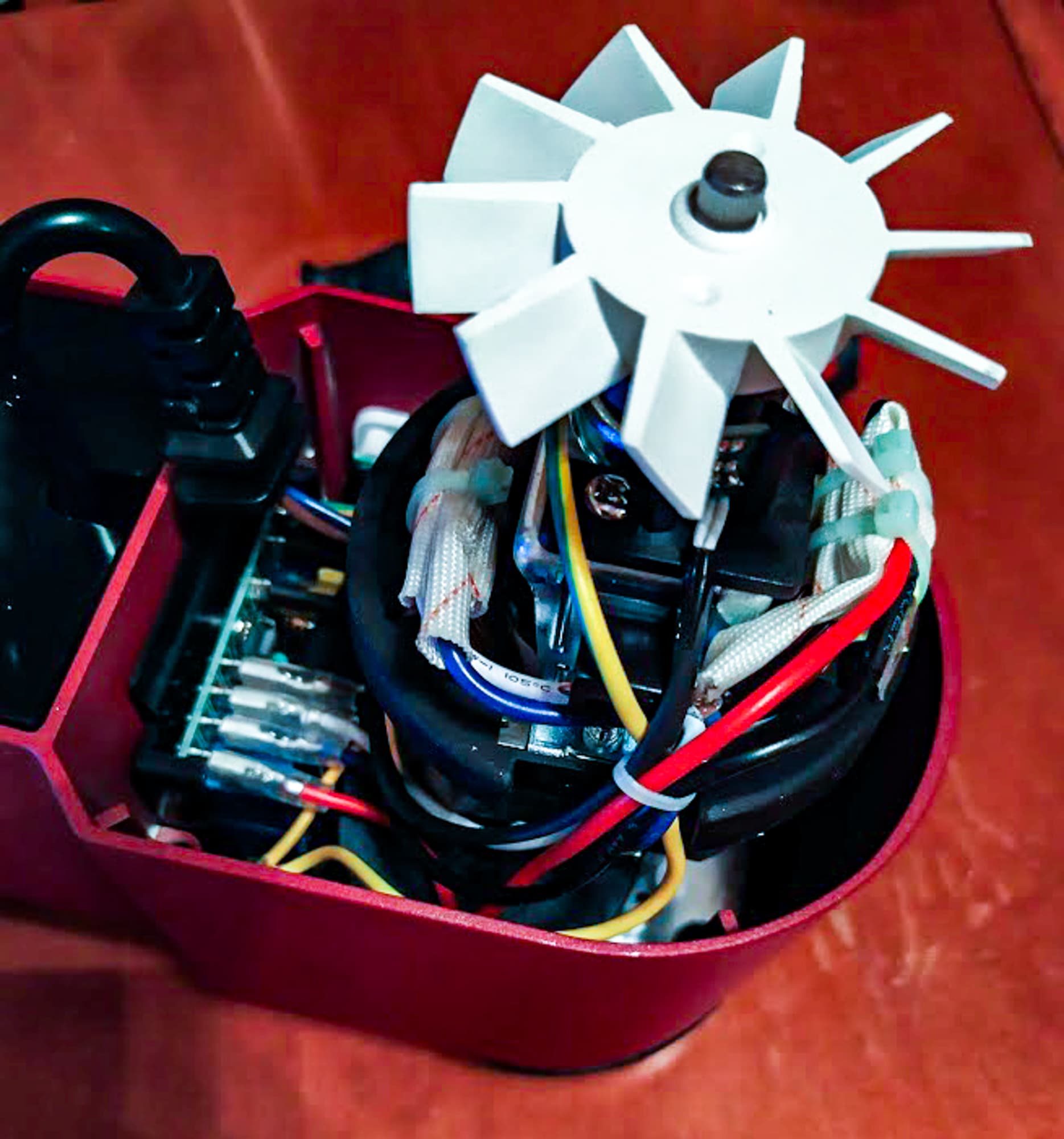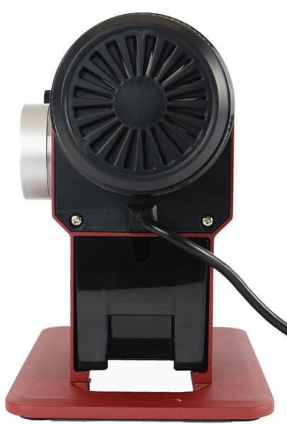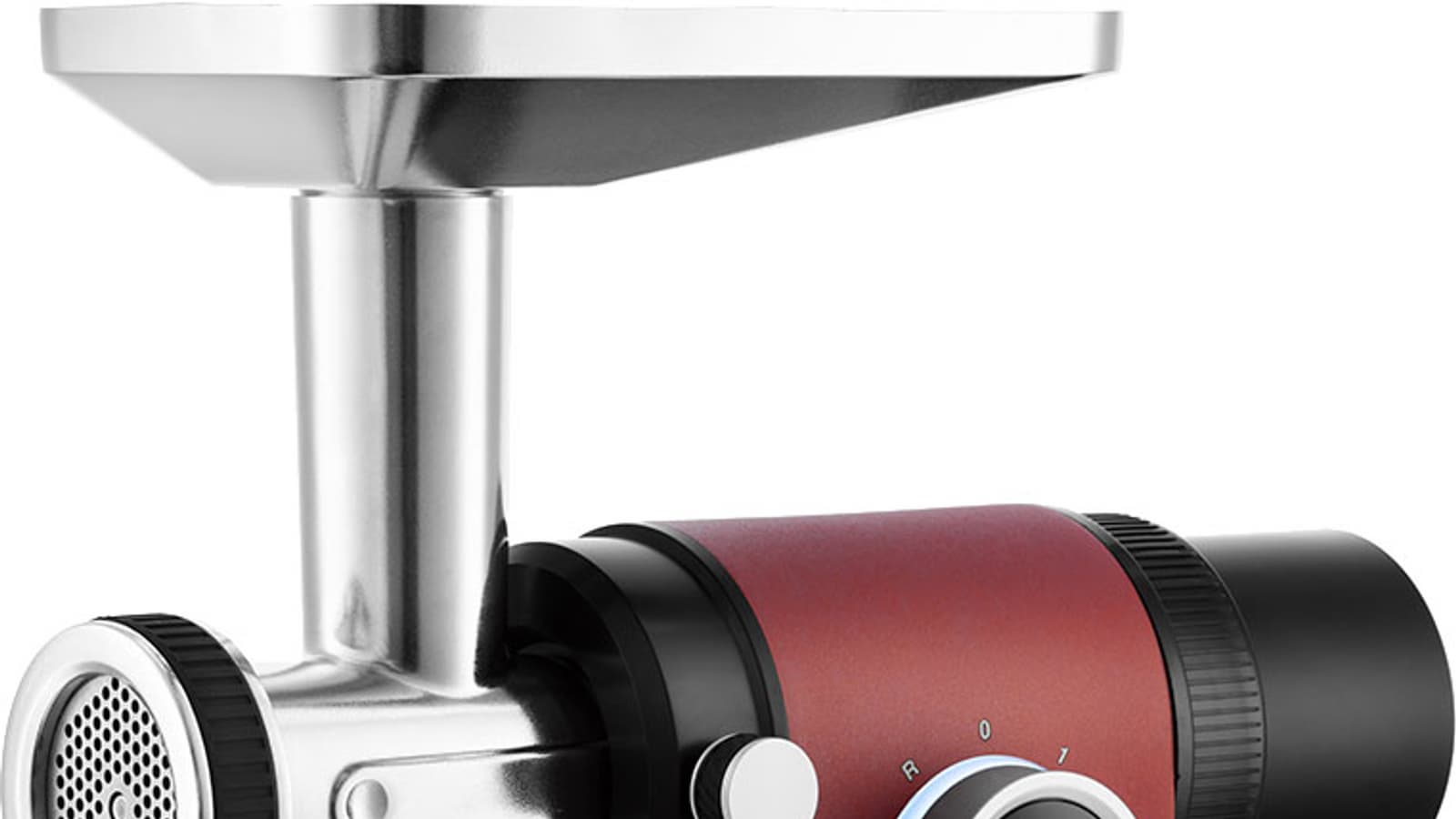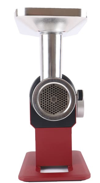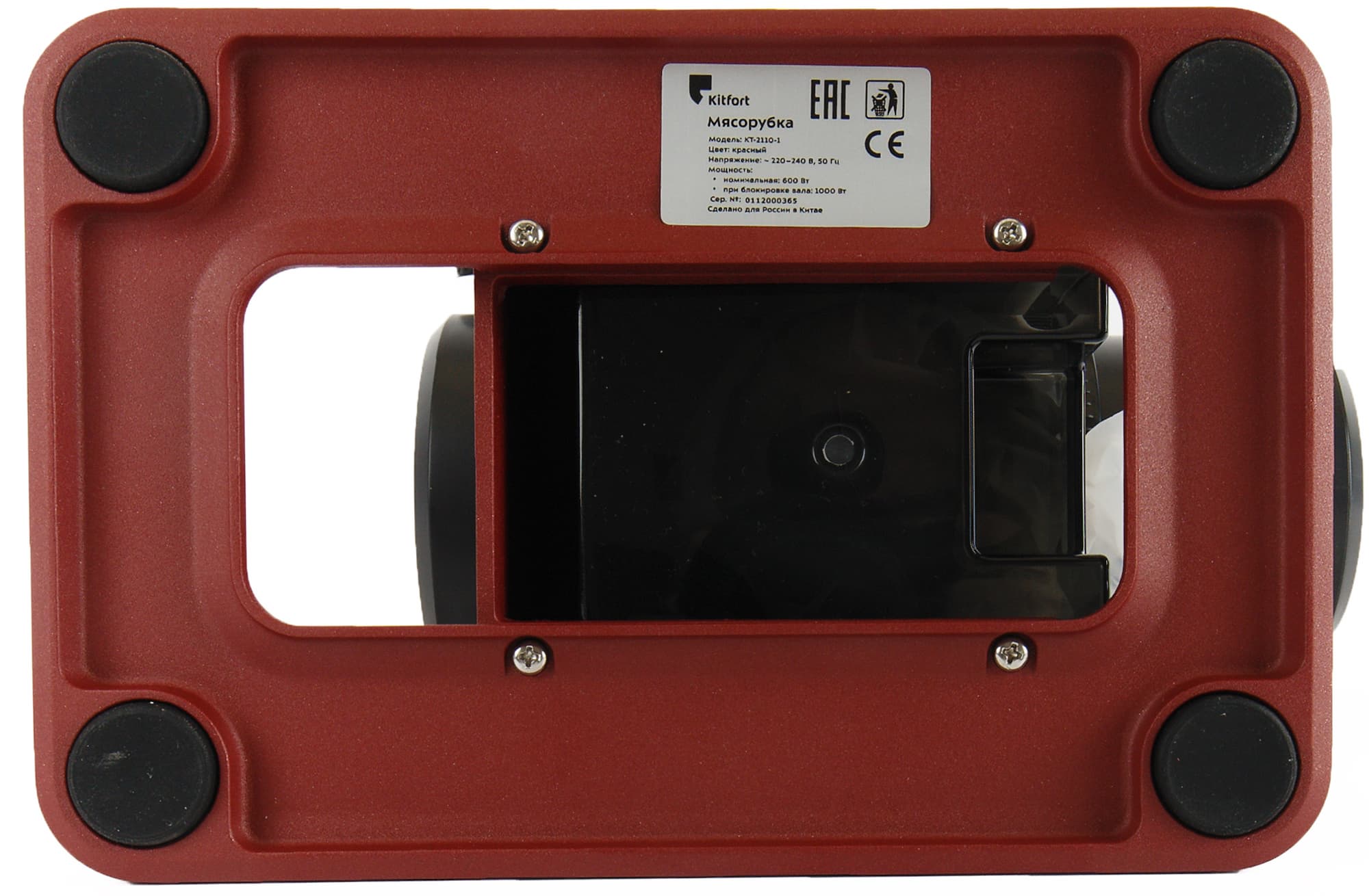 Выглядит KT-2110-1 оригинально: красный металлический корпус имеет не традиционную форму трапеции — из основания поднимается «ножка», на ней кольцо, и в него вставлен черный кожух, в котором спрятан мотор и охлаждающая система. В этот же черный элемент вставляется горловина. Такая конфигурация придает мясорубке компактность и даже видимую легковесность.