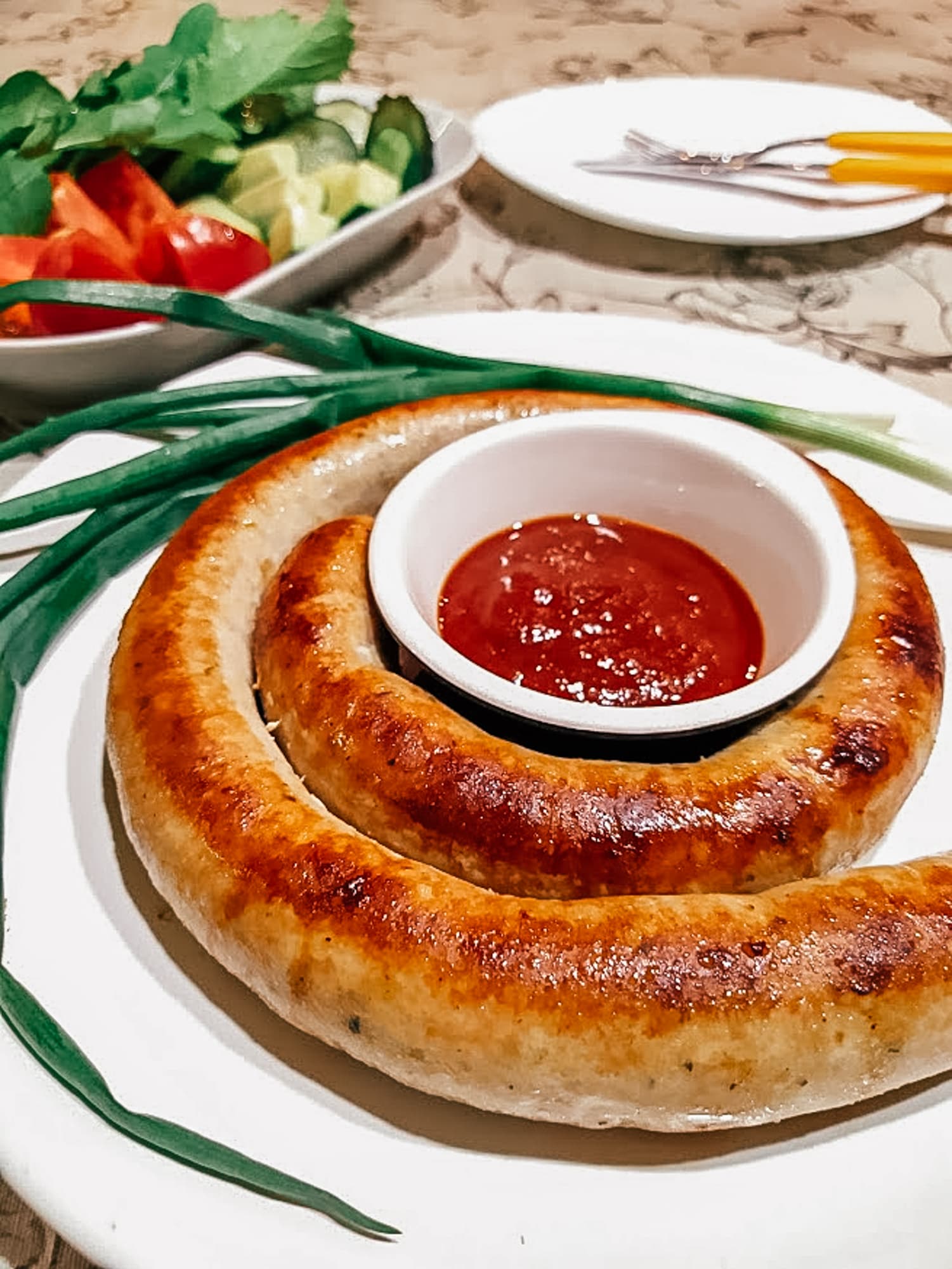 Полученные колбаски мы поджарили и подали со свежими овощами.