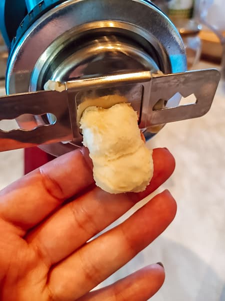 Отдохнувшее тесто отправляли в горловину и принимали на выходе, отрезая кусочки от вылезающей из насадки колбаски. Работали на первой скорости, так как на второй тесто вылетало уж как-то совсем лихо. Признаться, процесс нас не впечатлил, как-то это все бестолково: песочное тесто требует холода и сноровки, а тут с ним проводится множество манипуляций, оно начинает таять, да и красотой получающиеся заготовки не отличаются.