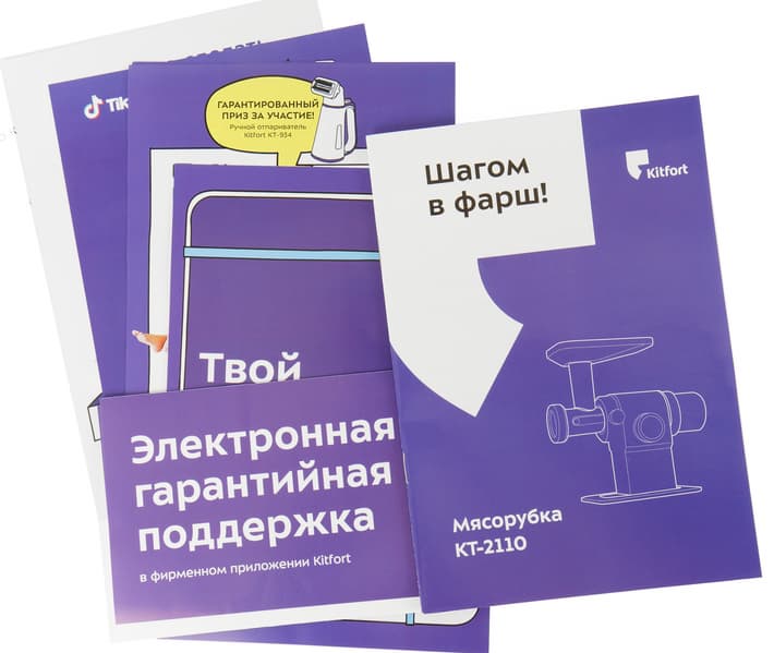 Руководство об эксплуатации — стандартная для Kitfort брошюра в бело-фиолетовой обложке с изображением прибора.