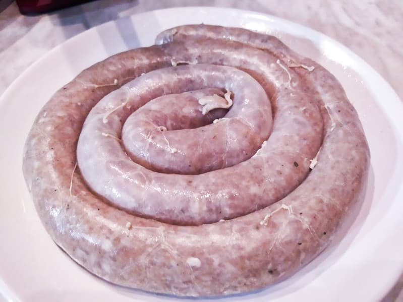 В фарш добавили специи, немного коньяку, вымешали до белковых нитей и поставили в холодильник вызревать. Через некоторое время подготовили свиную кишку и приступили к набивке колбасы с помощью специальной насадки. Работали на первой скорости. Завзятые мастера колбасных дел легко справляются в одиночку, мы же привлекли ассистента: он проталкивал фарш в горловину и выключал мясорубку, если возникала такая необходимость. Процесс шел легко, фарш отлично захватывался шнеком и заползал в кишку как миленький.