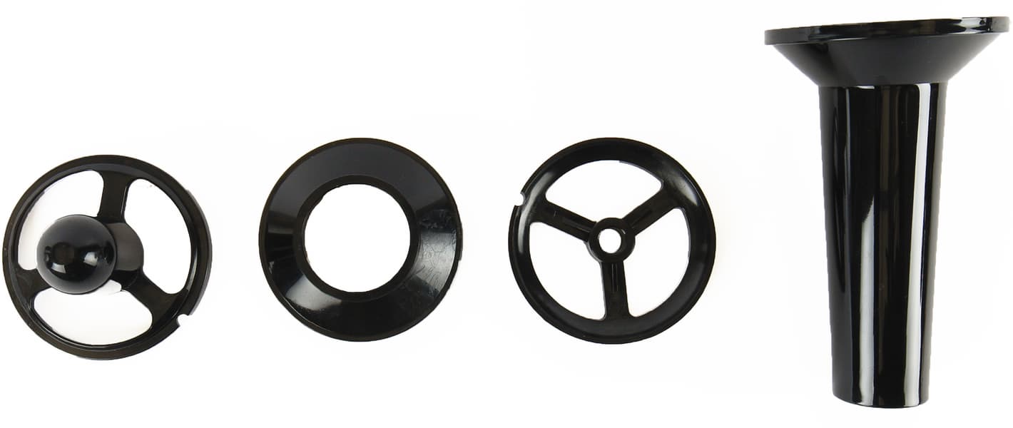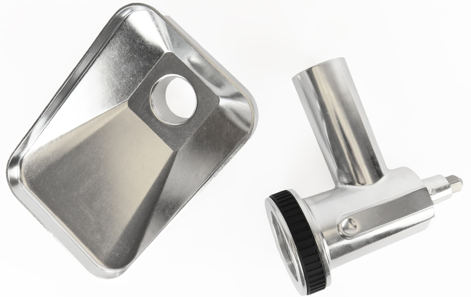 Корпус KT-2110-1 миниатюрный, и аксессуары ему под стать: лоток всего 15×22 см, а диаметр горловины — 4 см. Учитывая не самую высокую производительность мясорубки, габаритов лотка вполне достаточно, но мясо придется порезать помельче. Кольцевая гайка покрыта по краю ребристой резиной — рука не скользит ни при попытке крепко закрутить фиксатор, ни при его отвинчивании.